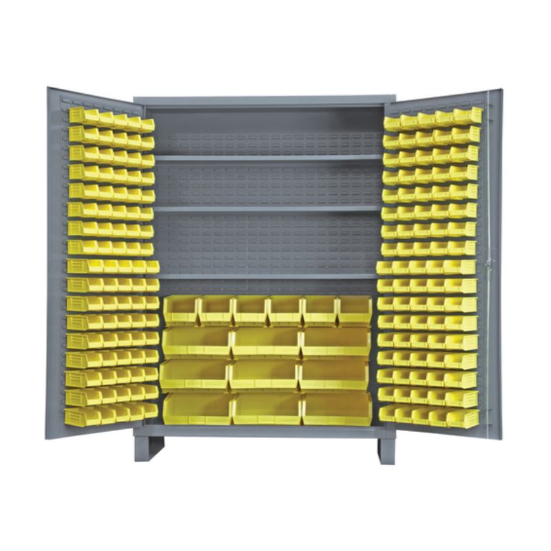 Vestil VSC-SSC-185 Steel/Plastic Storage Cabinet with 185 Yellow Bins is designed for high density storage and organization of parts. This cabinet offers easy accessibility to contents while maintaining cleanliness and security. Bins are made of a durable polyethylene with molded-in back hook for secure hanging. Front edges are lowered for better visibility and easier part picking. When not in use bins can be stacked on shelves, worktables, carts, or other flat surfaces. Comes standard with padlock handle (padlock not included).