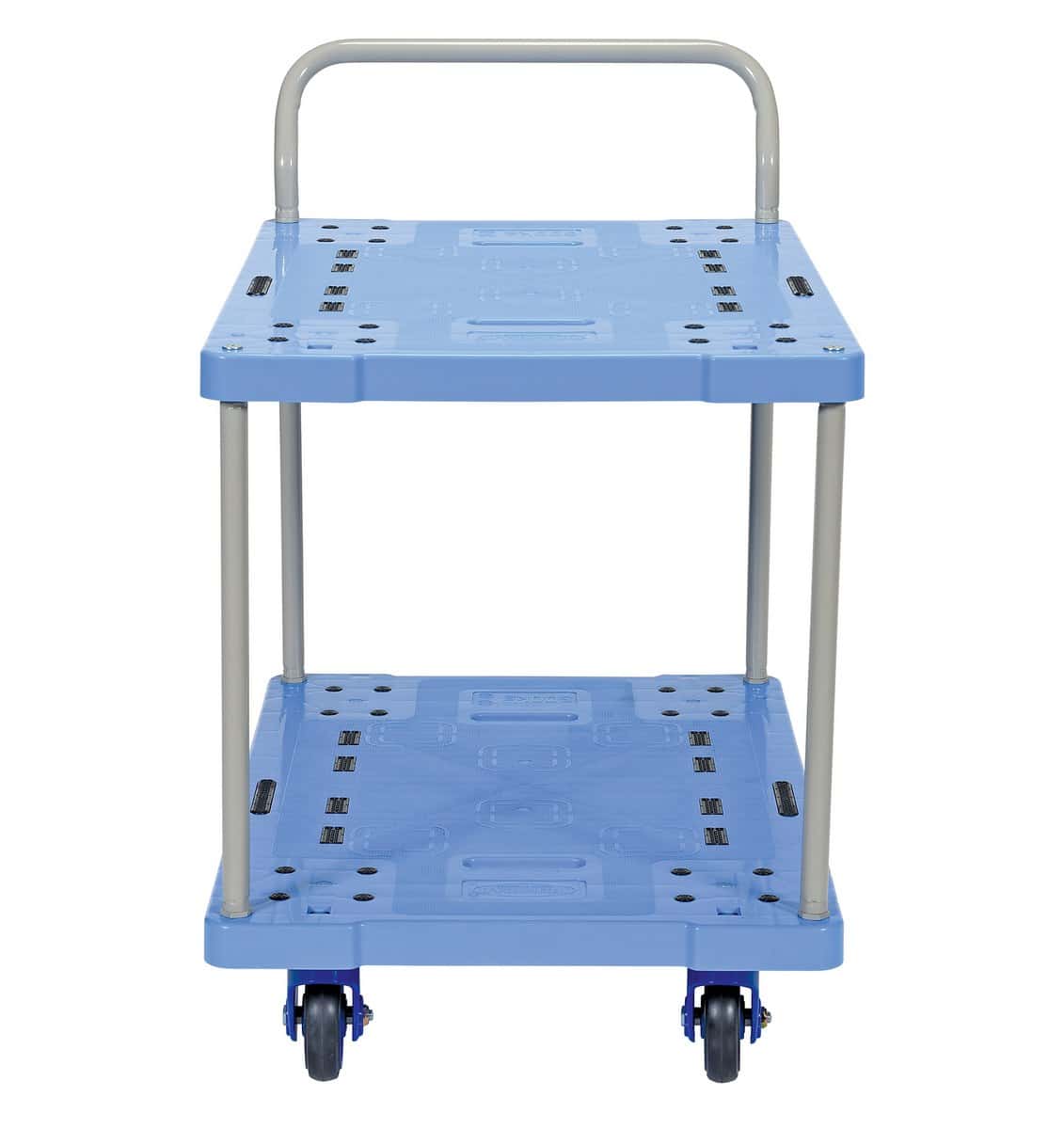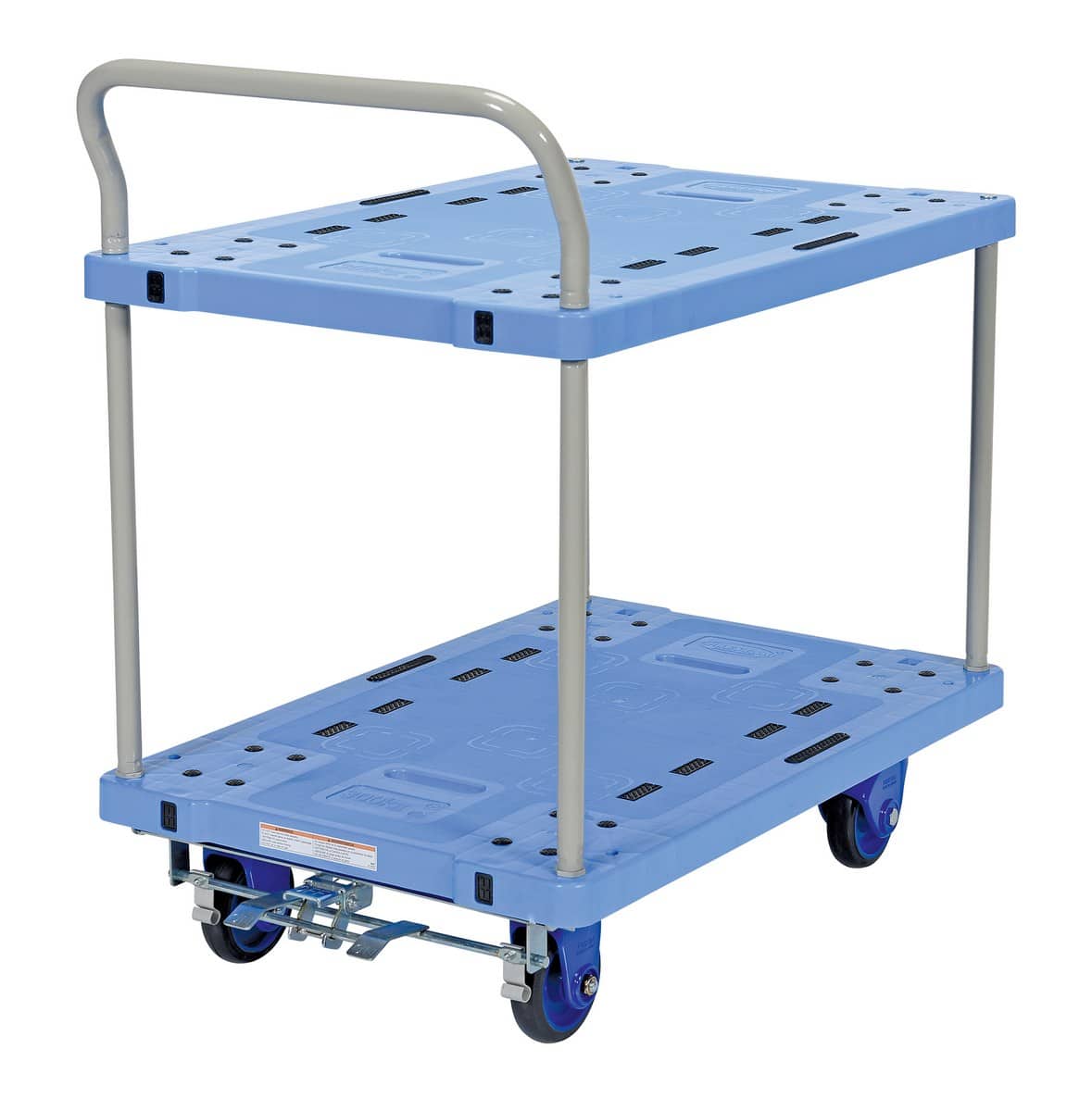 The Vestil TRP-2334-2-FB Plastic Truck Double Deck with Floor Brake is a great addition to the shipping and distributing facilities. The double-deck plastic platform creates a durable, yet lightweight construction that can be transferred simply from workstation to workstation. The unit rolls on casters for smooth transference over a variety of terrains, while the brake keeps the unit steady when not in progress. The attached handle creates a more ergonomic posture for personnel during use.