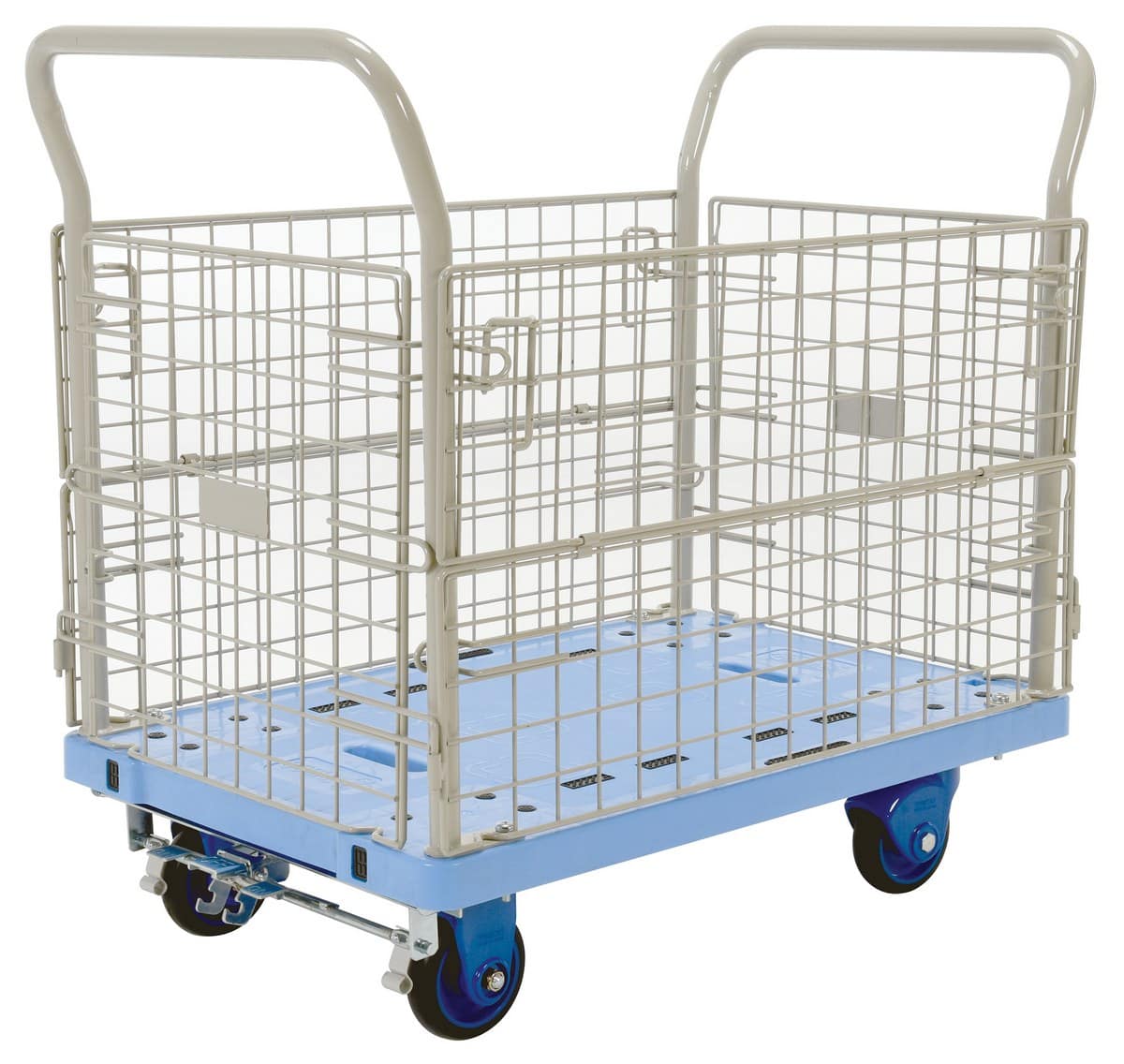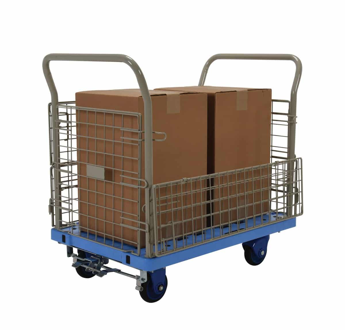 The Vestil TRP-2334-M-FB Plastic Truck Mesh Sides with Brake is a great addition to the shipping and distributing facilities. The plastic platform creates a durable, yet lightweight construction that can be transferred simply from workstation to workstation. The unit rolls on casters for smooth transference over a variety of terrains, while the side nets enable the utmost security. The attached handle creates a more ergonomic posture for personnel during use, while the brake keeps the unit steady when not in progress.