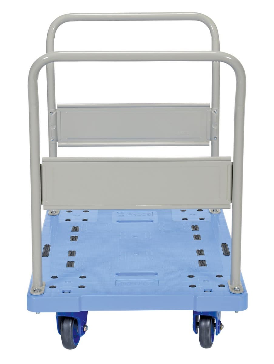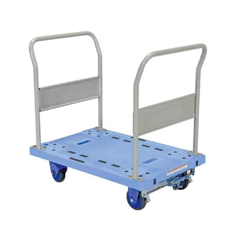 The Vestil TRP-2429-DH-FB Plastic Truck Dual Handles with Floor Brake is a great addition to the shipping and distributing facilities. The plastic platform creates a durable, yet lightweight construction that can be transferred simply from workstation to workstation. The unit rolls on casters for smooth transference over a variety of terrains, while the side nets enable the utmost security. The double-handled design creates a more ergonomic posture of personnel during use, while the brake keeps the unit steady when not in progress.