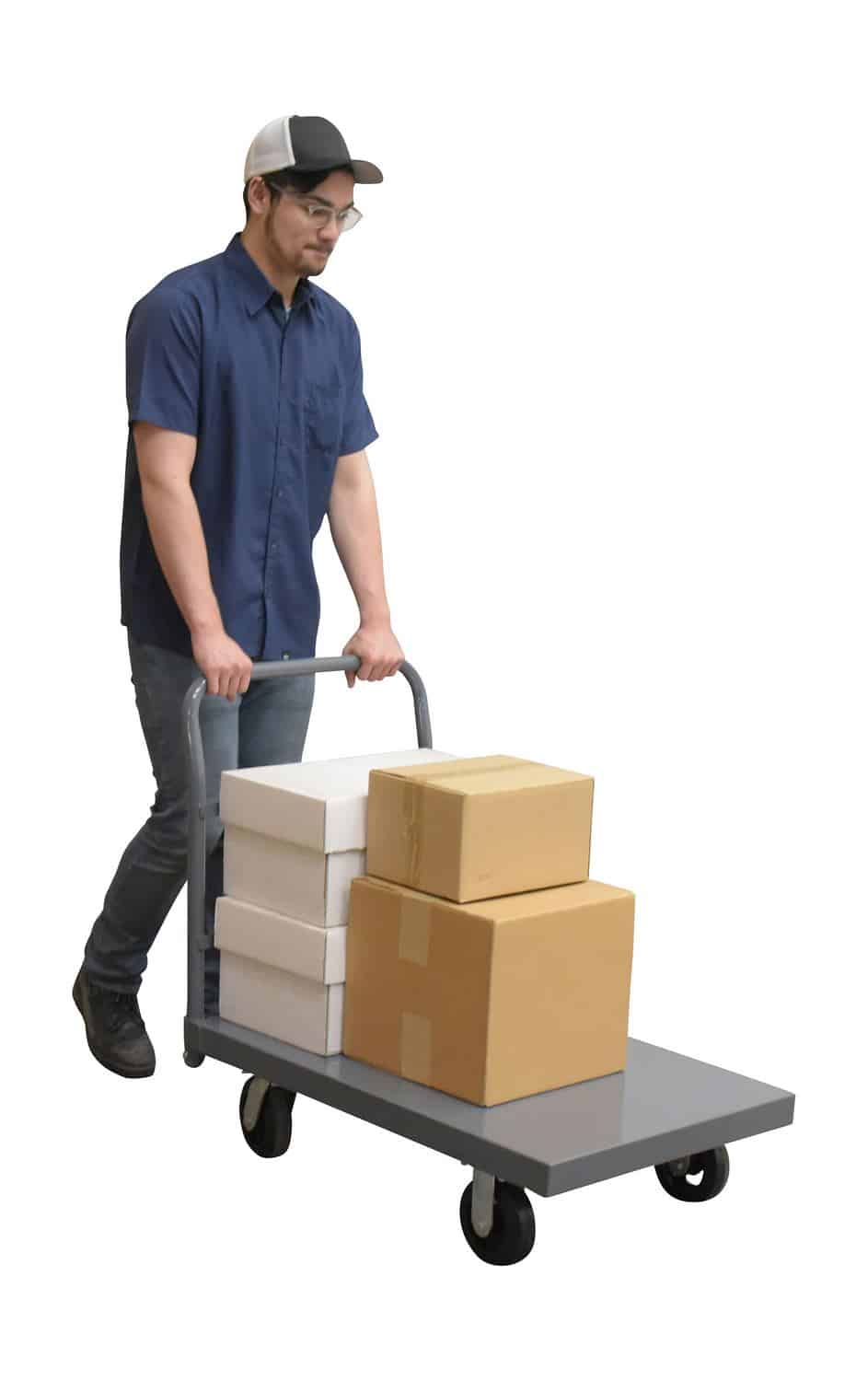 A Vestil ECSPT-2436 Steel Smooth Deck Platform Truck is a perfect addition to any warehouse or shipping center. The steel platform design provides the user with a better sense of security. With a smooth surface, the amount of abrasion and scuffs during movement is limited. The steel handle allows the user to maintain an ergonomic posture while transferring goods. Mold on rubber casters roll smoothly. Powder coated finish provides added toughness.