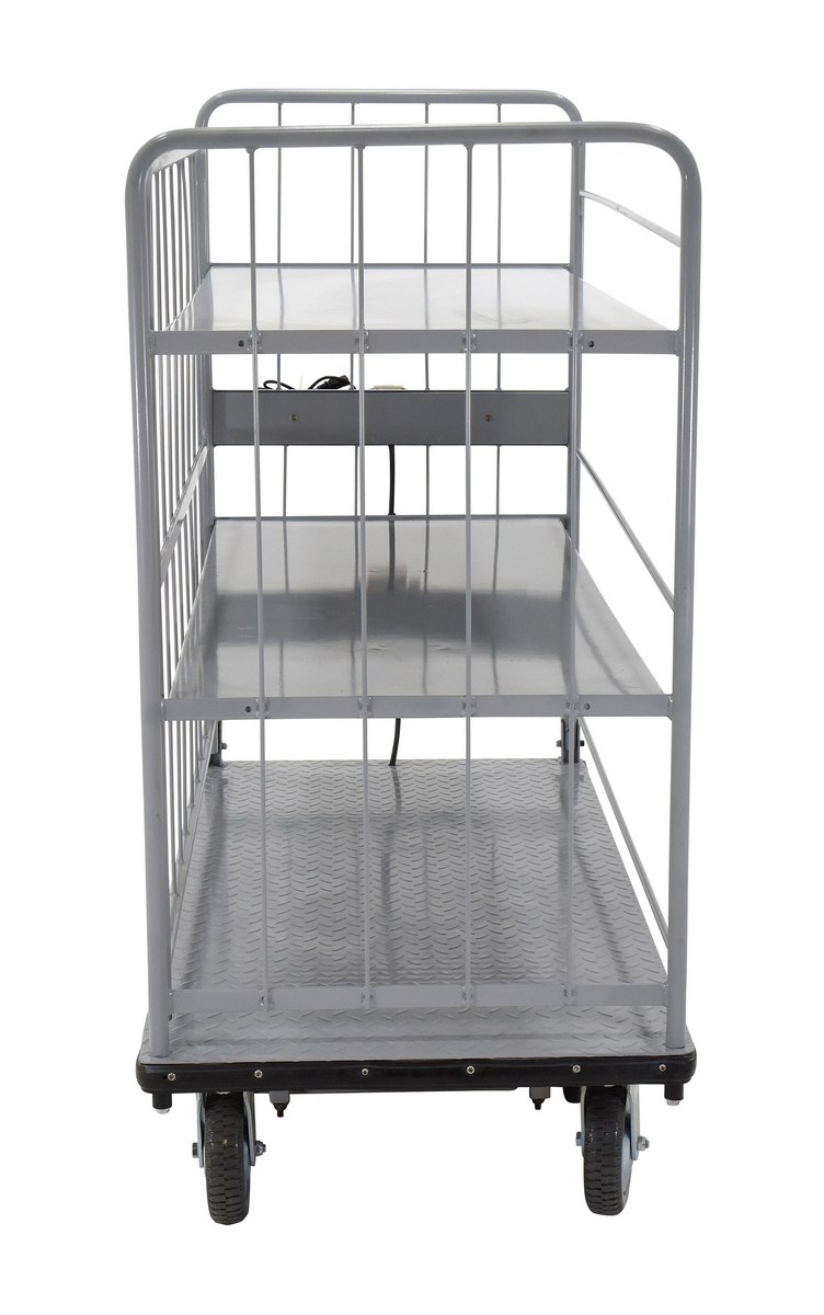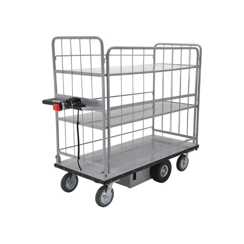 The Vestil EMHC-2860-4 Steel Electric Material Handling Cart with Sides is ideal for moving heavy loads safely and easily throughout warehouses, offices, schools, and hospitals and incorporates a multitude of features to make light work of heavy loads. Reduce injury and increase productivity with these high quality carts. Features an 800W electric drive motor with (2) two 12V batteries for power and on-board 115V AC battery charger. The handle includes forward and reverse throttle control levers, an emergency reverse switch, a battery level gauge, and a slow/fast speed switch. Pinpoint turning is accurate with the mid-axle drive feature.