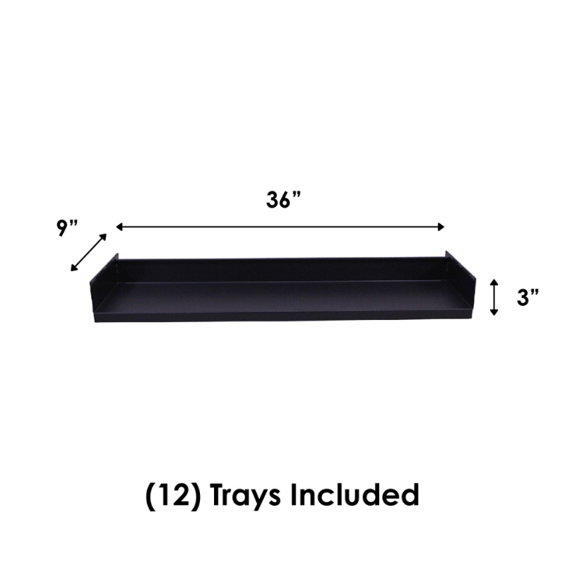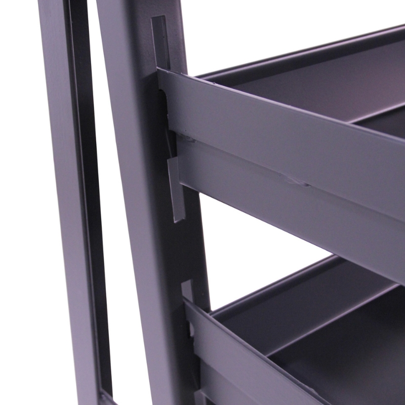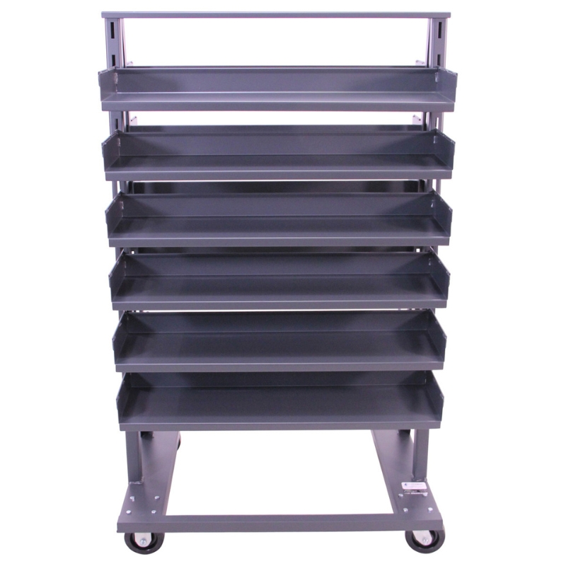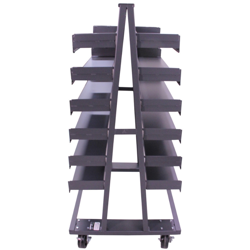 Valley Craft’s (F89064VCGY) Double-Sided Heavy Duty A-Frame Cart weighs 215 lbs. and is built from rugged 12-gauge steel with a gray powder coat finish that supports 5S initiatives. It comes equipped with 12 steel trays and offers options for expansion with additional trays (9”D or 15”D, flush or lipped), dividers, bins, hanger bars, and spindles (sold separately). Made in the U.S.A. and shipped fully assembled.