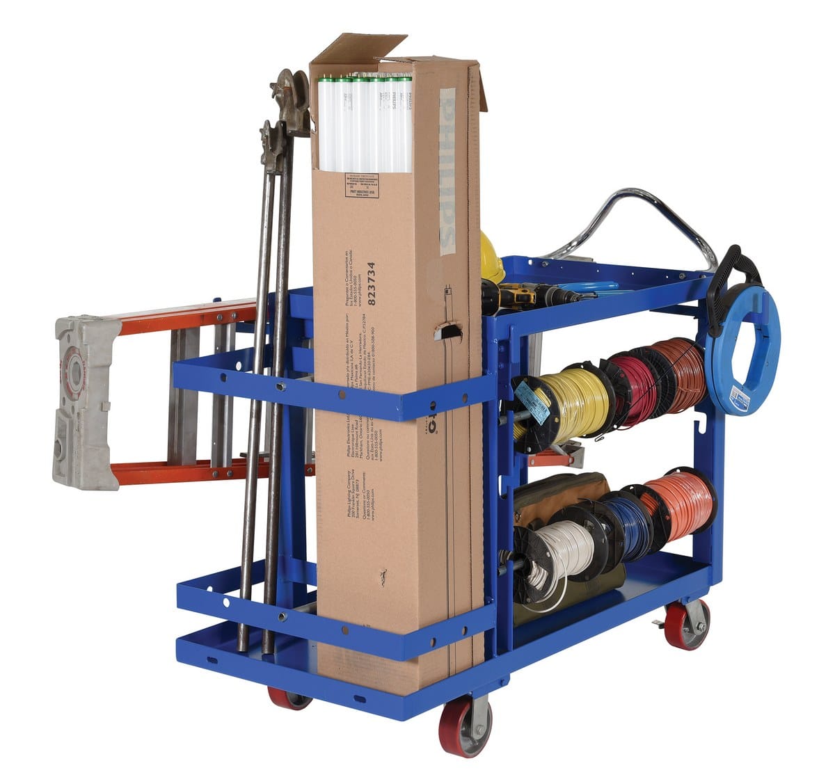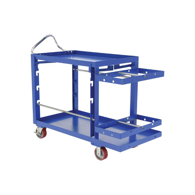 The Vestil ELEC-2448-2 Steel Electrician Cart is ideal for maintenance and repair facilities. The unit is designed to transport the materials needed for restoring and installing electrical fixtures. The cart is constructed of steel for strength and durability in rough conditions. Casters enable the cart to roll smoothly when traveling from workstation to workstation. An extended chrome plated handle allows for ergonomic friendly maneuvering when transporting.