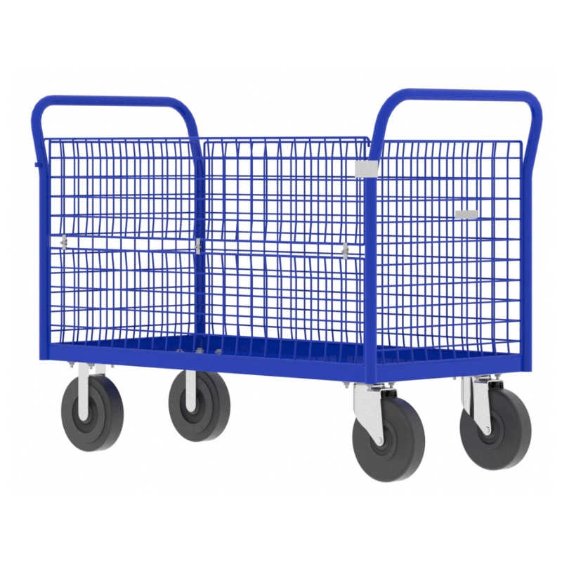 Valley Craft’s (F80126VCBL) 4-Sided Cage Cart (48″L x 24″W, 52″L overall) holds 1,600 lbs in a 14-gauge steel frame with a blue powder coat. Featuring 2×2” wire grid sides, a fold-down half panel, dual 4” handles, and four 8” rubber casters (2 rigid, 2 locking swivel), it’s U.S.-made and fully assembled.