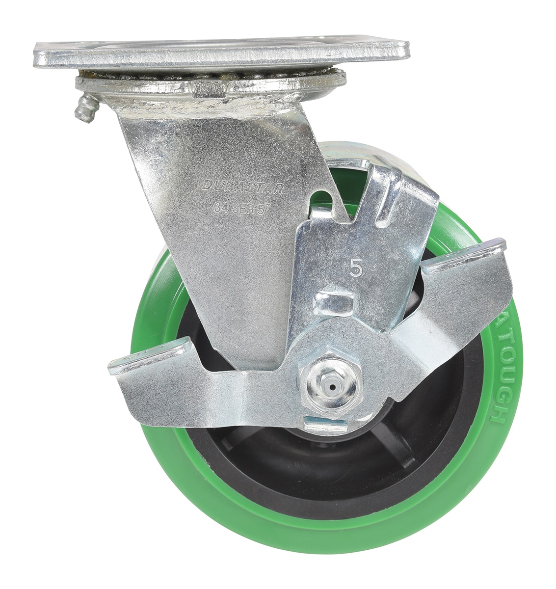 Equip yourself with the Vestil CST-F34-5X2DT-SWB Polyurethane Swivel With Brake Caster and enjoy a new level of caster performance. Featuring a 100% pure polyurethane tread cast using liquid flow fusion, this advanced technology ensures superior mechanical bonding to maximize durability while zero trapped air provides improved aesthetics. The proprietary blended rubber also offers excellent floor preservation as well as an extended lifespan compared to traditional polyurethanes – all wrapped in an eye-catching green hue! A special 90 -95 shore ‘a’ construction increases resistance against debris and most chemicals for greater peace of mind.