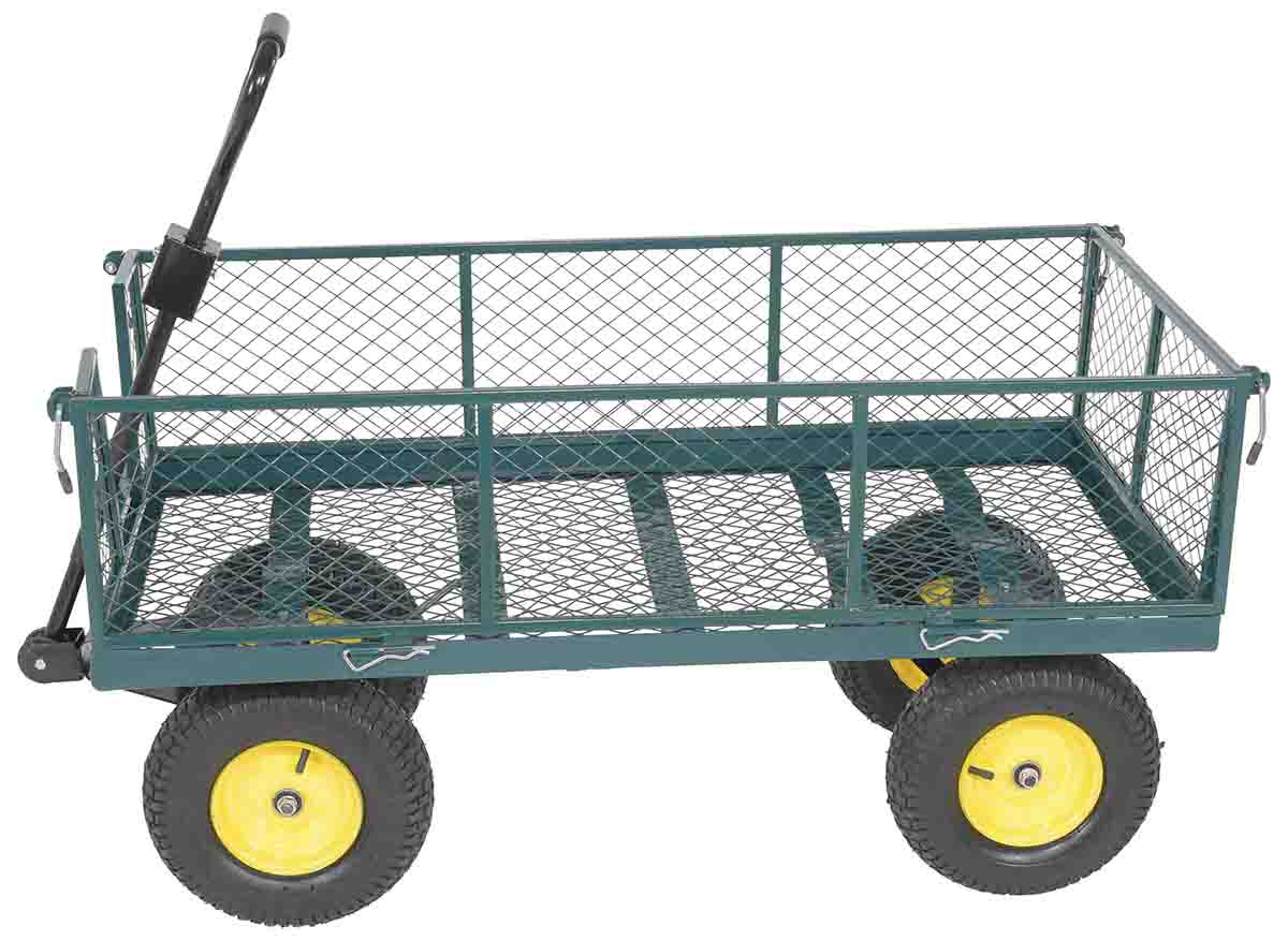 Get your gardening gear moving with the Vestil LSC-2448-4SD Steel Landscape Cart with Fold Down Side! This sturdy cart can handle up to 1000 lbs. of plants, flowers, trees, shrubs, rocks, and more. With its large pneumatic tires, smooth maneuvering is guaranteed. The mesh sides and bottoms let dirt, small rocks, and water drain through, while the towing coupler comes standard. Simplify your landscaping, nursery, or agricultural tasks with this versatile cart.