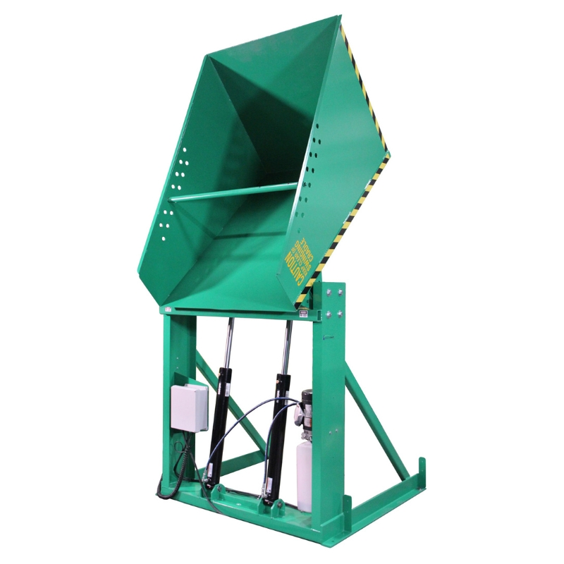 The Valley Craft Box Dumper (F80189A9) features a 36” x 36” chute, 48” dump height, and 4,000 lb. capacity, powered by a 460V, 2HP motor with dual flow hydraulics and a magnetic handheld pendant. Ships fully assembled and made in the U.S.A.
