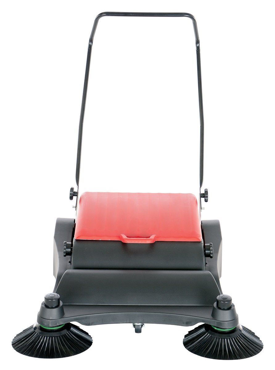 The Vestil JAN-LG Plastic/Steel Large Belt Driven Manual Brush Sweeper can be used anywhere, indoors or out, on concrete, asphalt, tile and commercial carpets. This sweeper is great for parking lots, gas stations, theaters, warehouses, schools, etc. This deluxe brush sweeper has two brushes, one on each front corner come with an independent height adjustment. The bottom center brushes also feature height adjustment and the unit features a folding handle for easy storage.