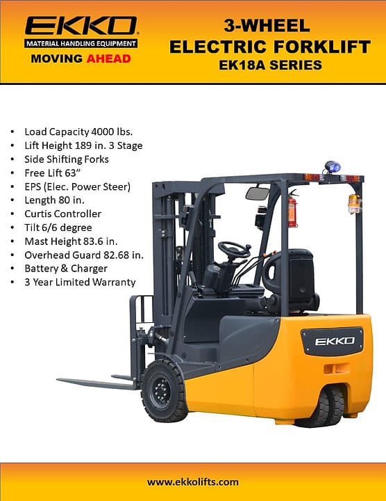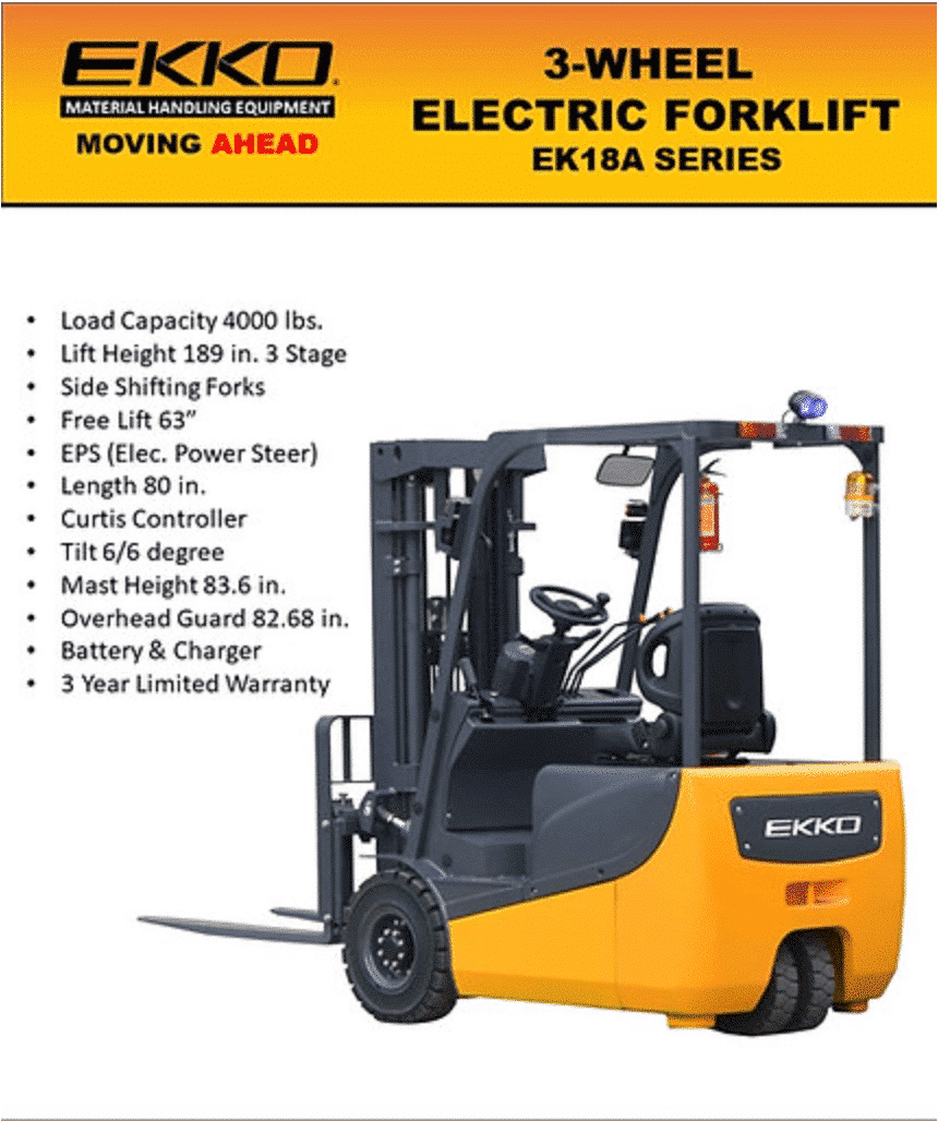 Designed to provide reliable, efficient, and high-performance material handling in any location or terrain – the EKKO EK18A 3 Wheel Electric Forklift is an indispensable tool. Made with steel components of superior quality plus robust drives that can handle heavy loads and sharp direction changes, this electric forklift ensures safe loading/unloading at truck docks, stock rooms, manufacturing floors as well as warehousing operations.