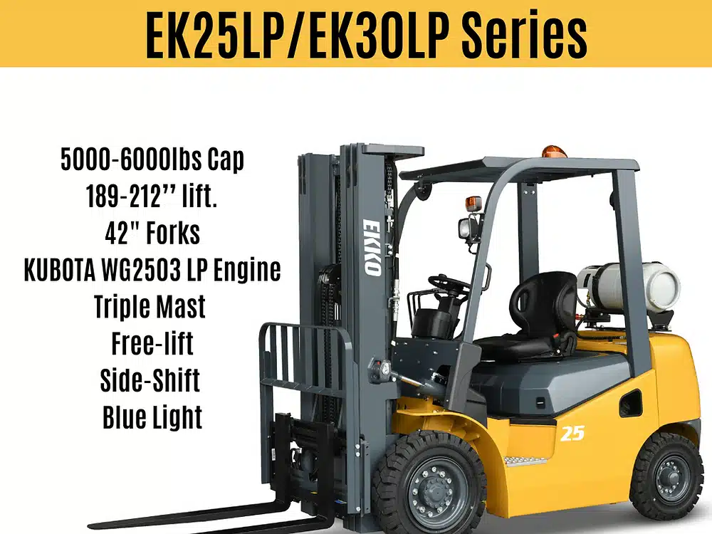 The EKKO EK25-212LP Pneumatic Forklift (LPG) 4-wheel forklift is the perfect solution for all your material handling needs. It’s built to take on any challenge with its high-quality construction and Kubota engine, which meets Tier 4 EPA standards. Plus, it comes at an attractive price point – making it a great choice for warehousing and distribution operations!