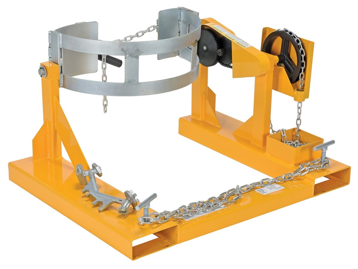 This Vestil DCR-205-8 Fork Truck Drum Carrier/Rotator For Steel Drums allows you to easily transport and rotate steel drums using a fork truck. Drums are held securely in place by a durable chain-locking system. The carrier/rotator is provided with a chain to allow the drum to be rotated from the fork truck operator’s seat. The drum must be full to rotate at rated capacity.