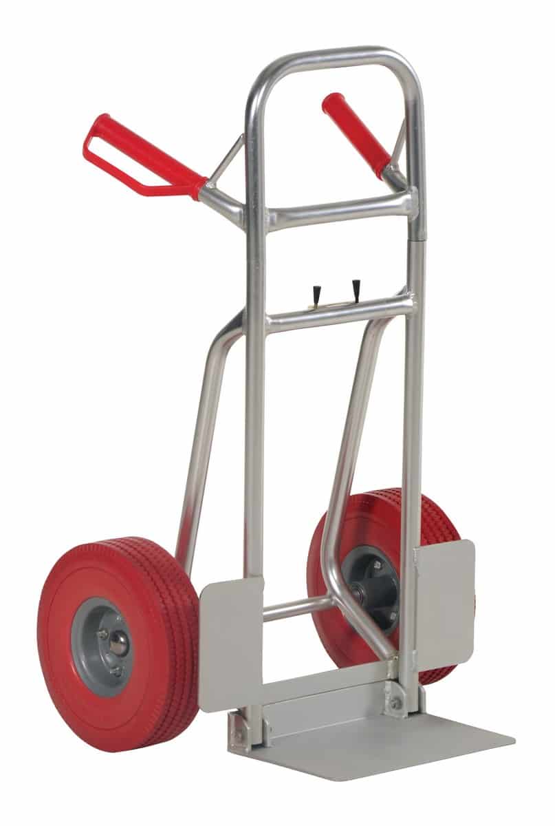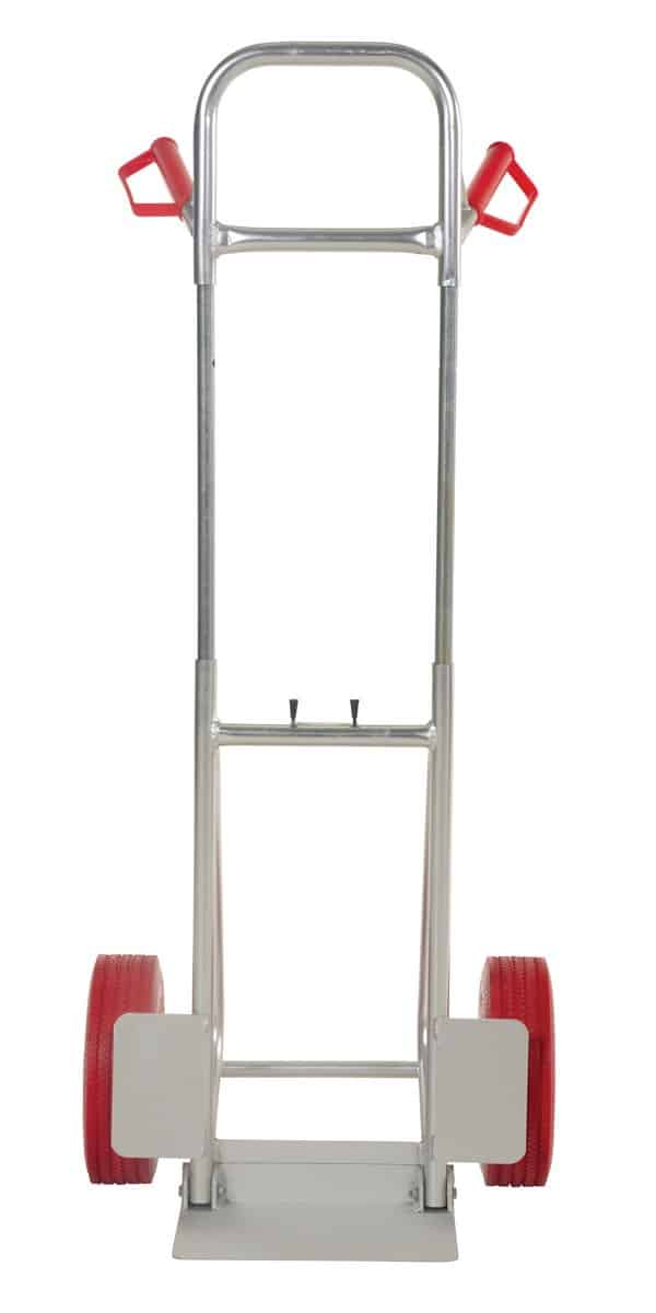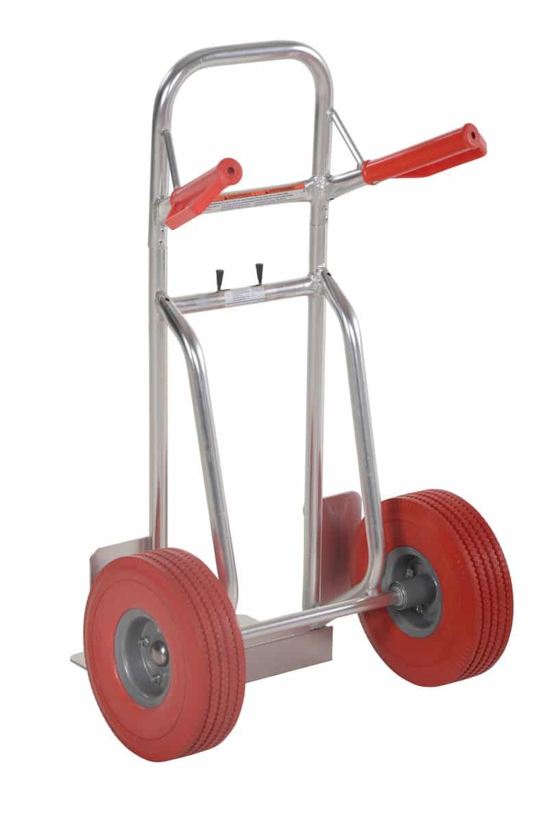 The Vestil DHHT-250A-FD-UR Aluminum Fold Down Hand Truck with Red Flat-Free Urethane folds down for storage. Telescopic upright is adjusted with spring-loaded locking mechanism. Dual handle design with plastic grips and knuckle guards. Rolls smoothly on wheels. Wheel guards are included for use with oversize objects. Unit ships fully assembled and ready to use.