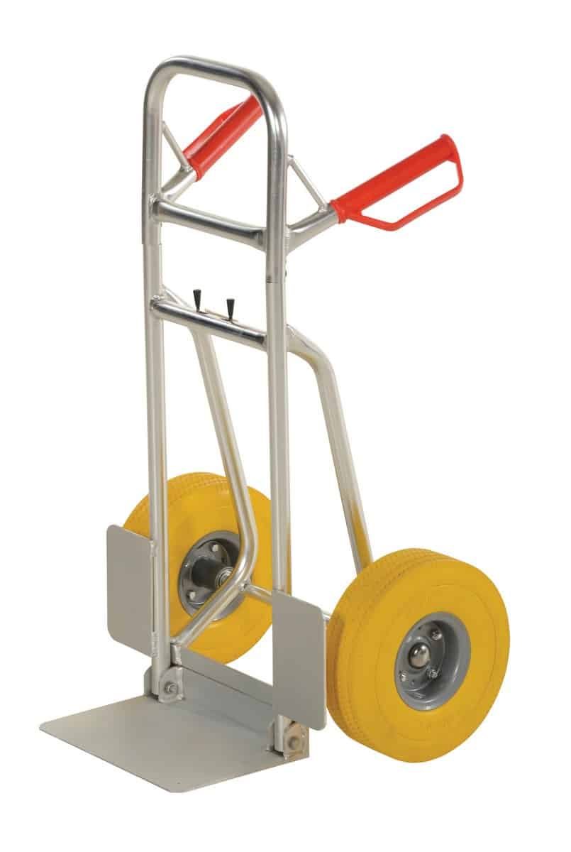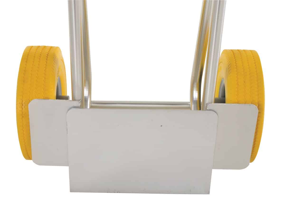 The Vestil DHHT-250A-FD-UY Aluminum Fold Down Hand Truck with Yellow Flat-Free Urethane folds down for storage. Telescopic upright is adjusted with spring-loaded locking mechanism. Dual handle design with plastic grips and knuckle guards. Rolls smoothly on wheels. Wheel guards are included for use with oversize objects. Unit ships fully assembled and ready to use.