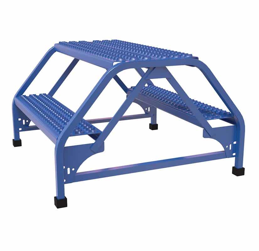 This unique Dual-Sided Step offers more versatility. The steps are made from perforated steel or grip strut steel. The base includes four feet with rubber tips to protect the floor. Steps are spaced 10″ apart. Constructed of steel with a powder coat blue finish. Portable units have a yellow finish.