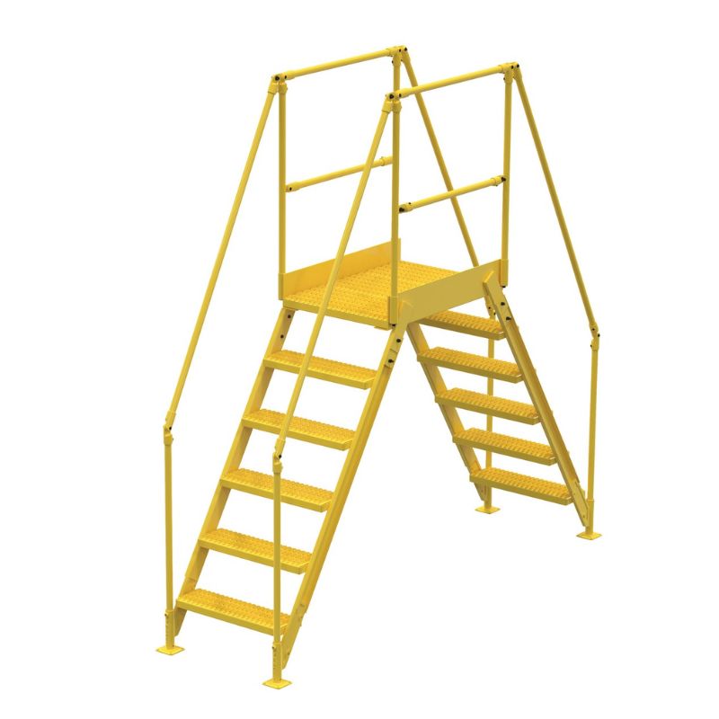 The Vestil COL-6-56-23 Steel Crossover Ladder mounts where you need permanent access at crossover points. The upper platform features removable two sided handrail with mid-rail and fixed toeboards to prevent objects from rolling off. Serrated steps for extra grip and safety. Ground legs include floor mounting pads. Unit must be anchored to the floor. Cross-Over Ladder is all welded steel construction but can be knocked-down for storage and shipping. Powder coat yellow finish.