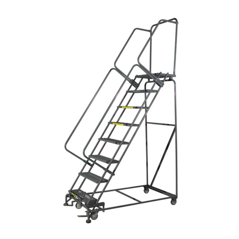 Make sure your commercial or industrial setting is fully equipped for a safe, reliable, and robust experience with the Ballymore SW832 8-Step Gray Steel 50-Degree Slope Walk Down Rolling Ladder. Its heavy-duty steel frame offers maximum supportability up to 450 lb., while the wide 24″ steps ensure user comfort and safety thanks to its 14″ deep top step. Highly resistant to scratching, water, chemical corrosion, and weathering due to its sleek grey powder-coated finish; it’s built for years of continual use in any establishment – plus you can easily move it around on 4 heavy-duty ball-bearing casters!