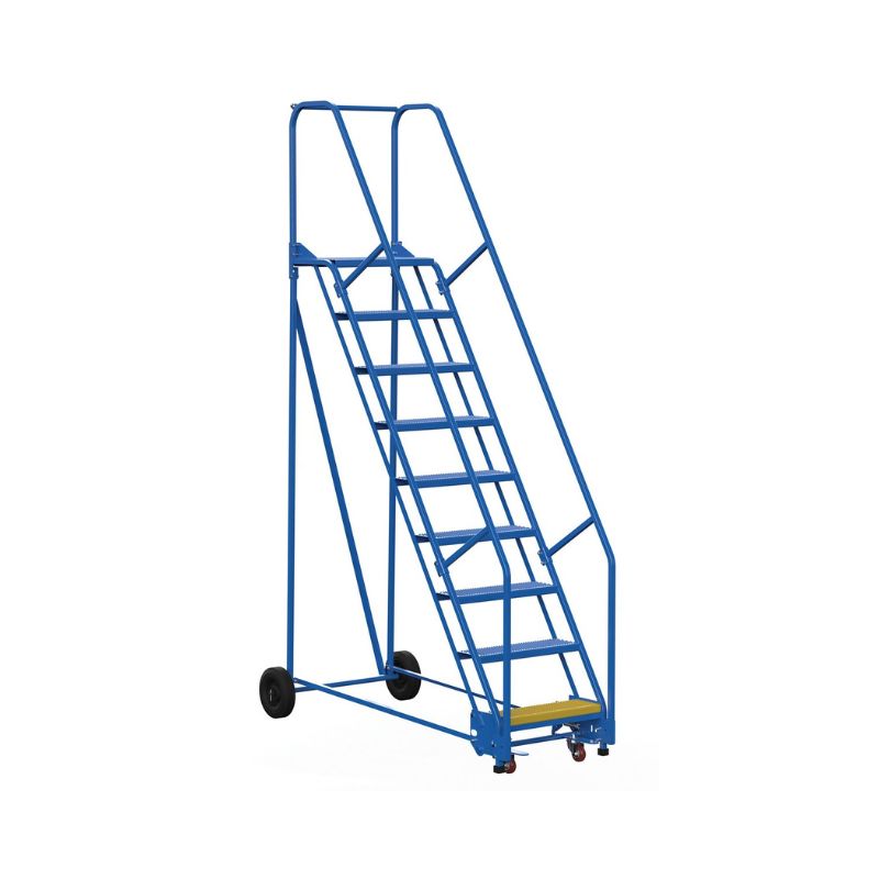 The Vestil LAD-9-14-P Steel Rolling Warehouse Ladder is a great addition to the material handling and shipping facilities. The strong welded construction is powder coated for a sleek reliable finish that will stay durable throughout daily use. The ladder construction promotes safety through a bottom yellow step that indicates the end of the unit. The unit can be locked in place by pressing the levers below the bottom step. Once levers are engaged the ladder cannot be moved. A resilient handrail offers stability while climbing and exiting the ladders.