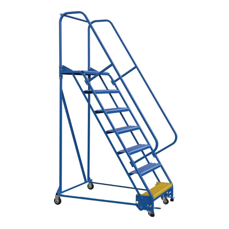 The Vestil LAD-PW-32-7-G Steel Standard Slope Ladder is a portable warehouse ladder for every-day use applications. Grip strut steps, handrail included, welded square tubular steel construction with powder-coat blue finish. Rubber feet provided for floor protection. Unit has bottom step lock casters for safe use when climbing.
