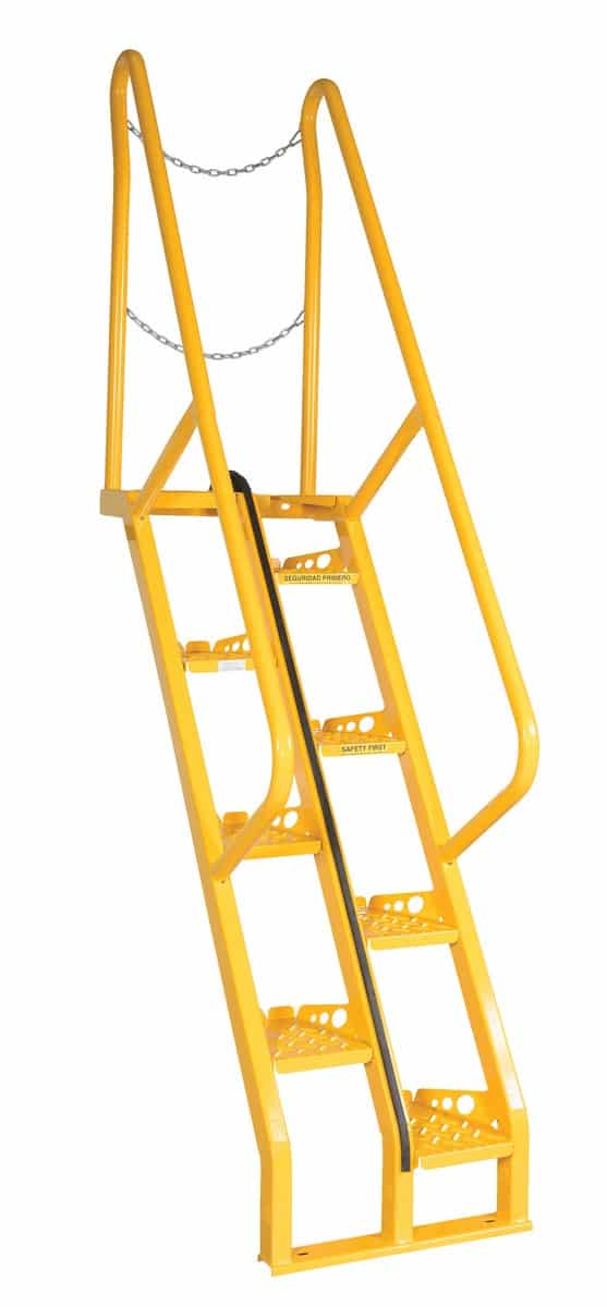 This Vestil ATS-5-56 Steel Alternate Tread Stair design offers a shorter span than traditional steps. Features handrail on each side of unit, dual safety chain at the top of the stair and formed steel steps with raised surfaces for better traction. Welded steel construction with bolt-on handrails.