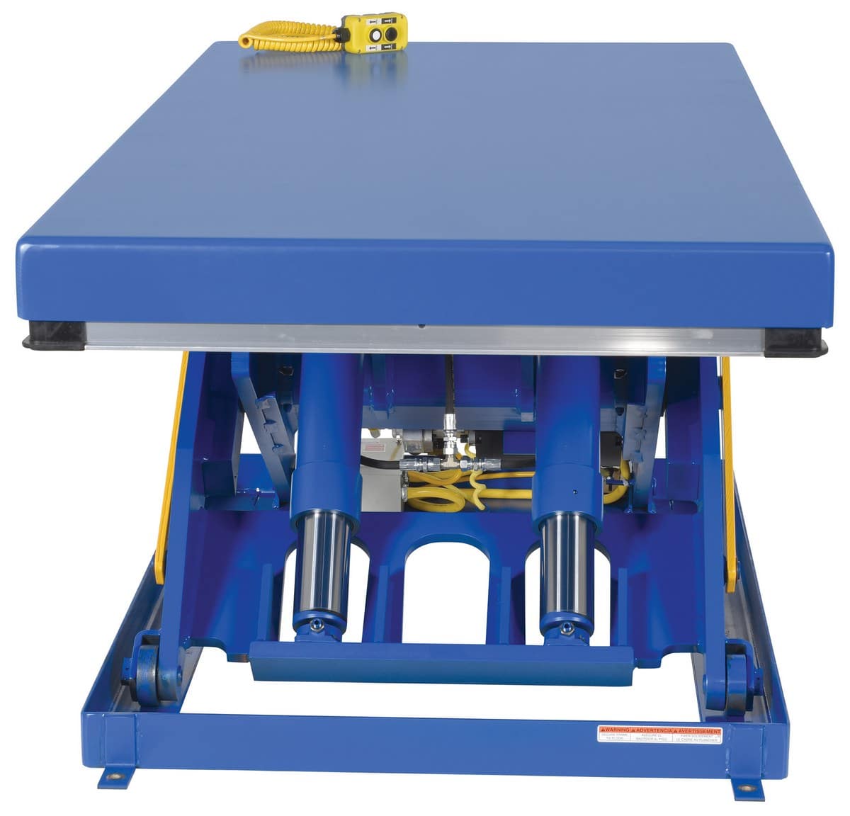 The Electric Hydraulic Scissor Lift Table is used by all types of manufacturing and warehouse facilities. Safety features include: patented pinch point perimeter toe guard to protect pinch points while lowering of the table, fused push button control, internal safety velocity fuse to maintain platform height in an event of hose or fitting failure, integral maintenance prop, adjustable upper travel limit switch to stop table at maximum height, and a displacement-style hydraulic cylinders for maximum strength. It also features a pressure plated pump, manifold system, displacement style hydraulic cylinder, and a state-of-the-art lifetime lubricated bearings. The standard 56 frame electric motor is a fully enclosed with optional voltages available. Contact factory if platform dimensions are crucial.
