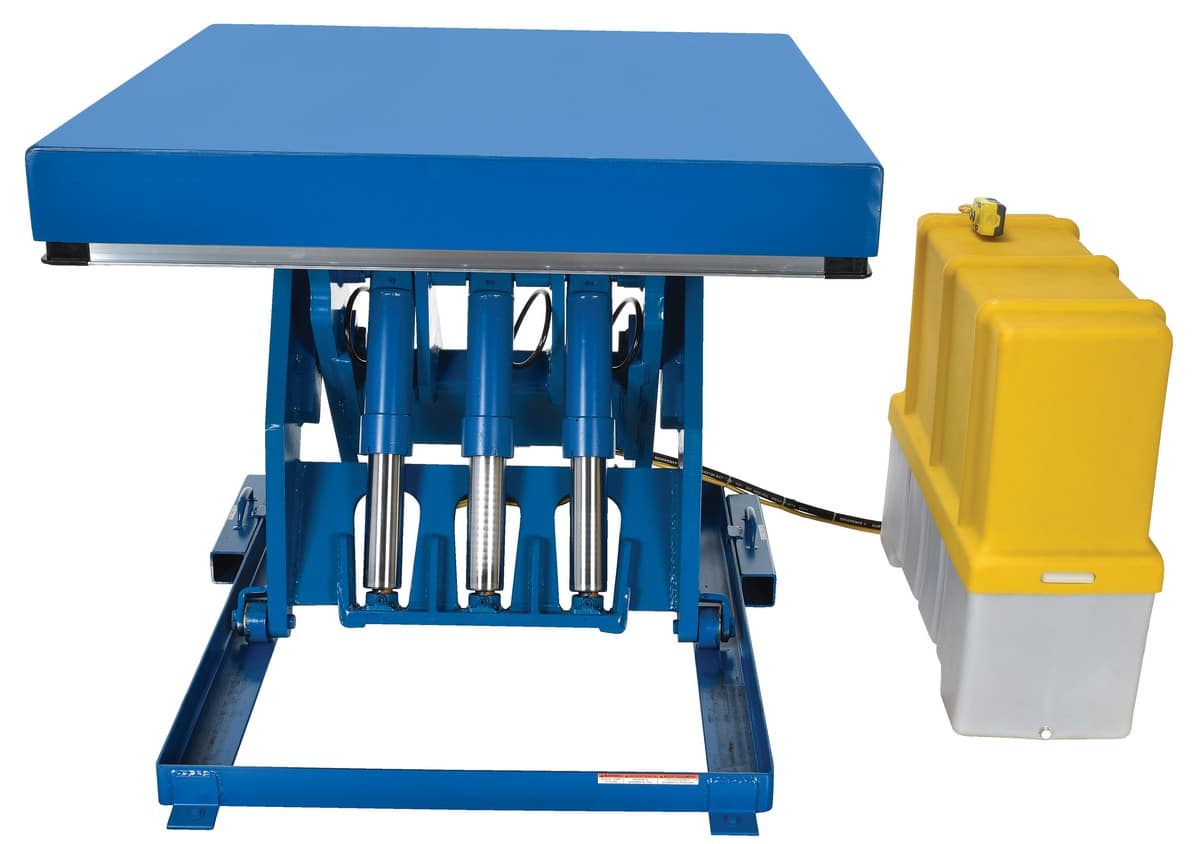 The Electric Hydraulic Scissor Lift Table is used by all types of manufacturing and warehouse facilities. Safety features include: patented pinch point perimeter toe guard to protect pinch points while lowering of the table, fused push button control, internal safety velocity fuse to maintain platform height in an event of hose or fitting failure, integral maintenance prop, adjustable upper travel limit switch to stop table at maximum height, and a displacement-style hydraulic cylinders for maximum strength. It also features a pressure plated pump, manifold system, displacement style hydraulic cylinder, and a state-of-the-art lifetime lubricated bearings. The standard 56 frame electric motor is a fully enclosed with optional voltages available. Contact factory if platform dimensions are crucial.