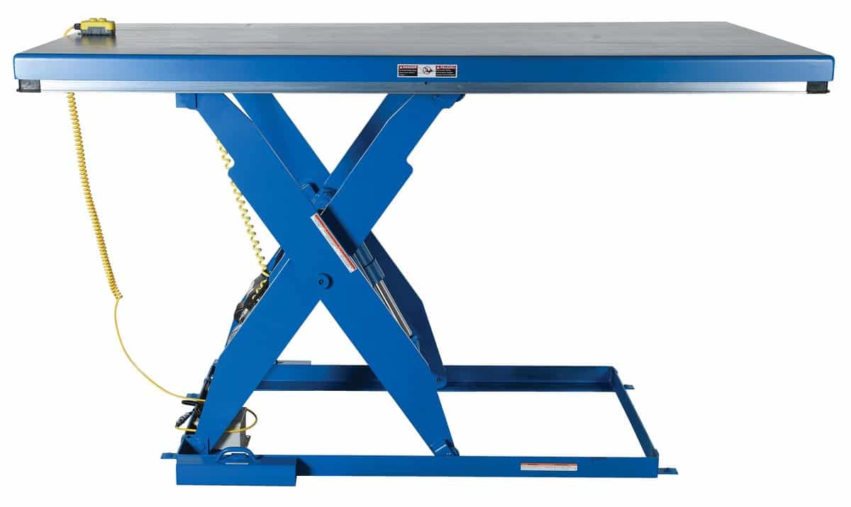The Electric Hydraulic Scissor Lift Table is used by all types of manufacturing and warehouse facilities. Safety features include: patented pinch point perimeter toe guard to protect pinch points while lowering of the table, fused push button control, internal safety velocity fuse to maintain platform height in an event of hose or fitting failure, integral maintenance prop, adjustable upper travel limit switch to stop table at maximum height, and a displacement-style hydraulic cylinders for maximum strength. It also features a pressure plated pump, manifold system, displacement style hydraulic cylinder, and a state-of-the-art lifetime lubricated bearings. The standard 56 frame electric motor is a fully enclosed with optional voltages available. Contact factory if platform dimensions are crucial.