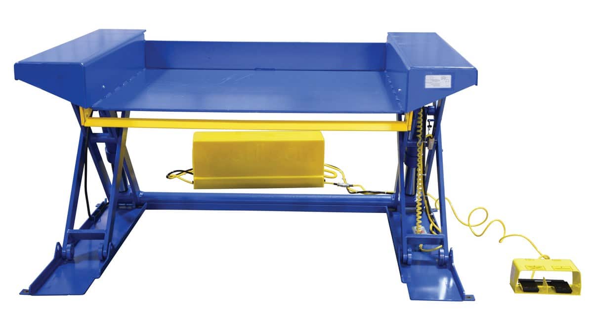 The Ground Lift Scissor Table is designed for use when fork trucks are not available. The pallets can be loaded onto the platform with pallet trucks and raised to an ergonomic working height. The safety features include: entry-side electric toe guard to protect pinch points during lowering of the table, velocity fuse to maintain platform height in the event of a hose or fitting failure, foot control, maintenance prop, and upper travel limit switch to stop table at maximum height reducing motor wear. The motor is totally enclosed standard with optional voltages available. The remote power unit can be located up to eight (8) feet away from the table. Optional accordion skirting is available.