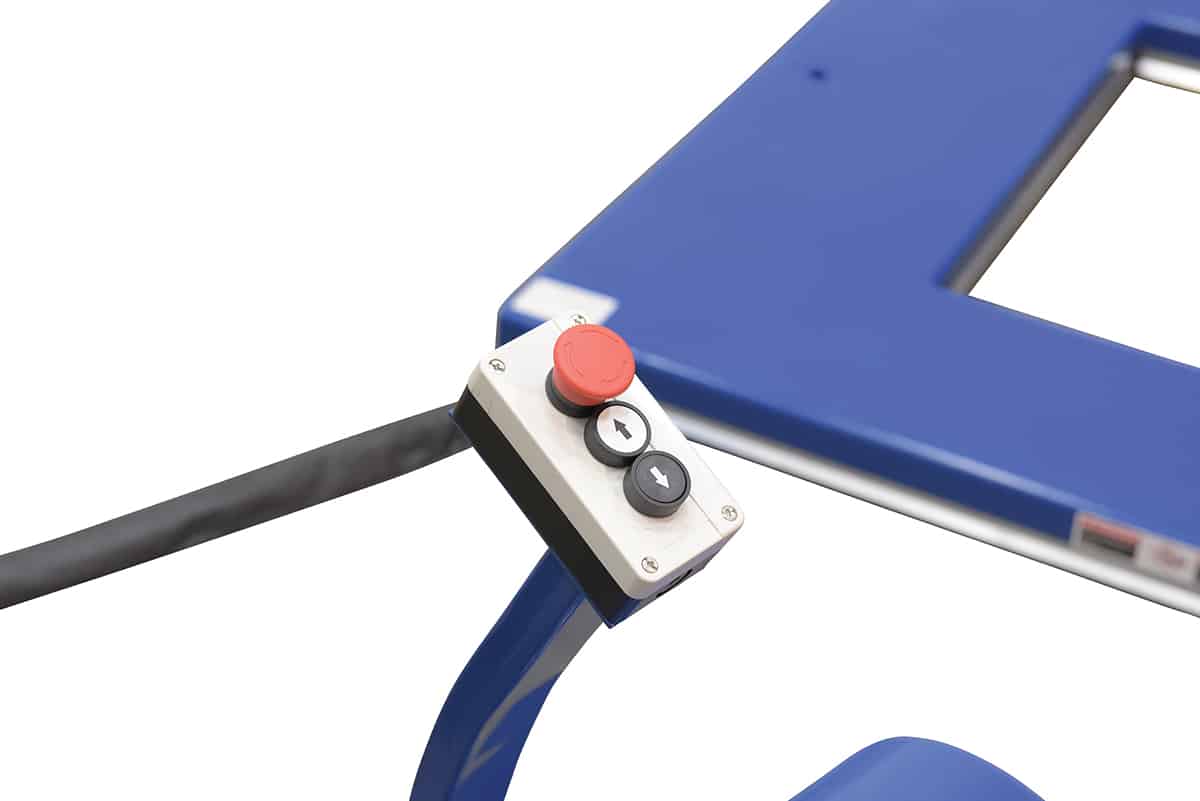 The Low Profile Electric Lift Tables with the unique, steel constructed, U design provides an open center that enables a pallet truck to place a load on the platform. This lift table features an external power pack equipped with a pressure relief valve that prevents overloading and a flow control valve that controls the lowering speed. The remote power pack comes complete with a cover to protect the motor from dust and debris. The UP and DOWN push button raises and lowers the unit and is located on the control box. Safety features include: toe guards, velocity fuse in cylinders, safety maintenance props, and an emergency stop button on the control box. The power supply has pedestal mounted push buttons. When using a pallet truck in conjunction with model, only open bottom pallets are to be used.