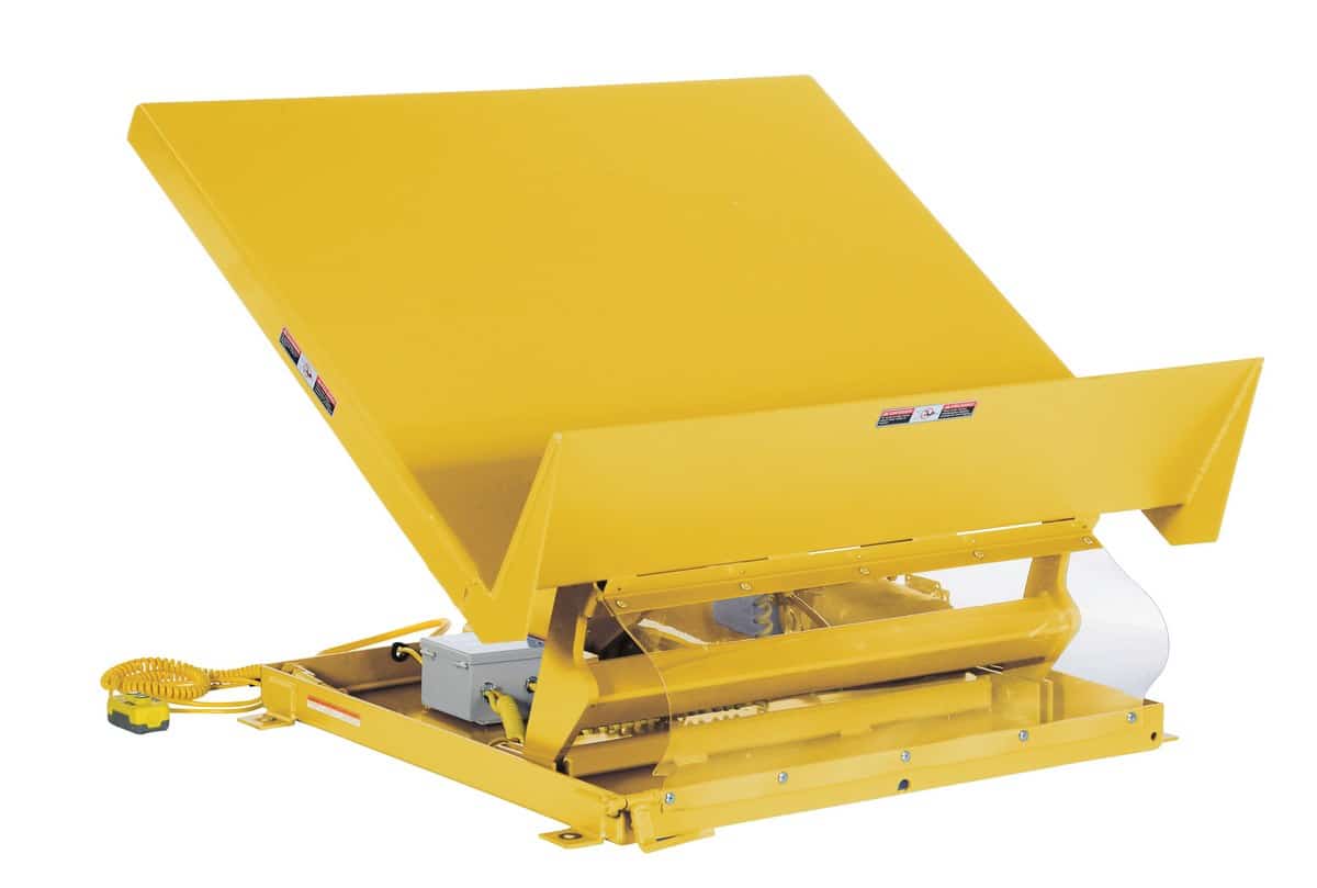The Single Scissor Lift & Tilt Table is designed to position containers within easy reach of assembly line workers and machine operators. The unique design reduces fatigue by minimizing repetitive bending and stretching required to obtain components from containers. This Scissor Table comes with a high lip on the tilt side which makes it ideal for parts transfer and assembly. The selector pedal allows the operator to lift while tilting, or tilt then lift. The motor is totally enclosed standard with optional voltages available. Other standard features include: a two-button handheld control, integrated maintenance lock, pressure plated pump, pressure compensated flow valve, lowering valve, independent oil return, and an adjustable upward travel switch. Scissor Table must be lagged to the floor.