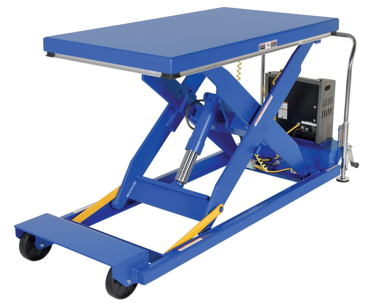 The Vestil PST-2-58 Steel Heavy Duty Portable Scissor Lift Table can easily transport and elevate heavy loads. Featuring glass nylon filled casters (2 swivel and 2 rigid), floor lock, patented electric pinch point guards, and magnetic hand controls. Key-operated ON/OFF control for better security is built into the power unit. Heavy duty 12V DC powered unit with deep cycle battery, an on-board battery charger and battery charge indicator gauge comes standard.