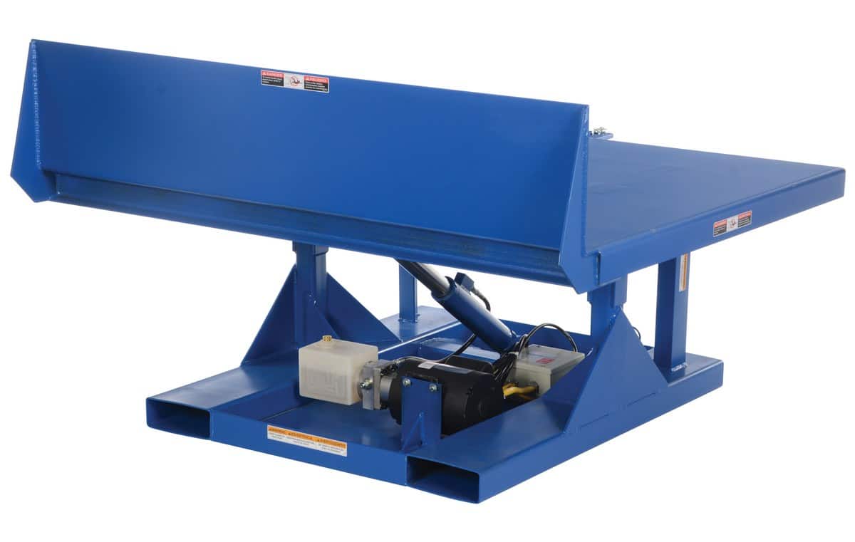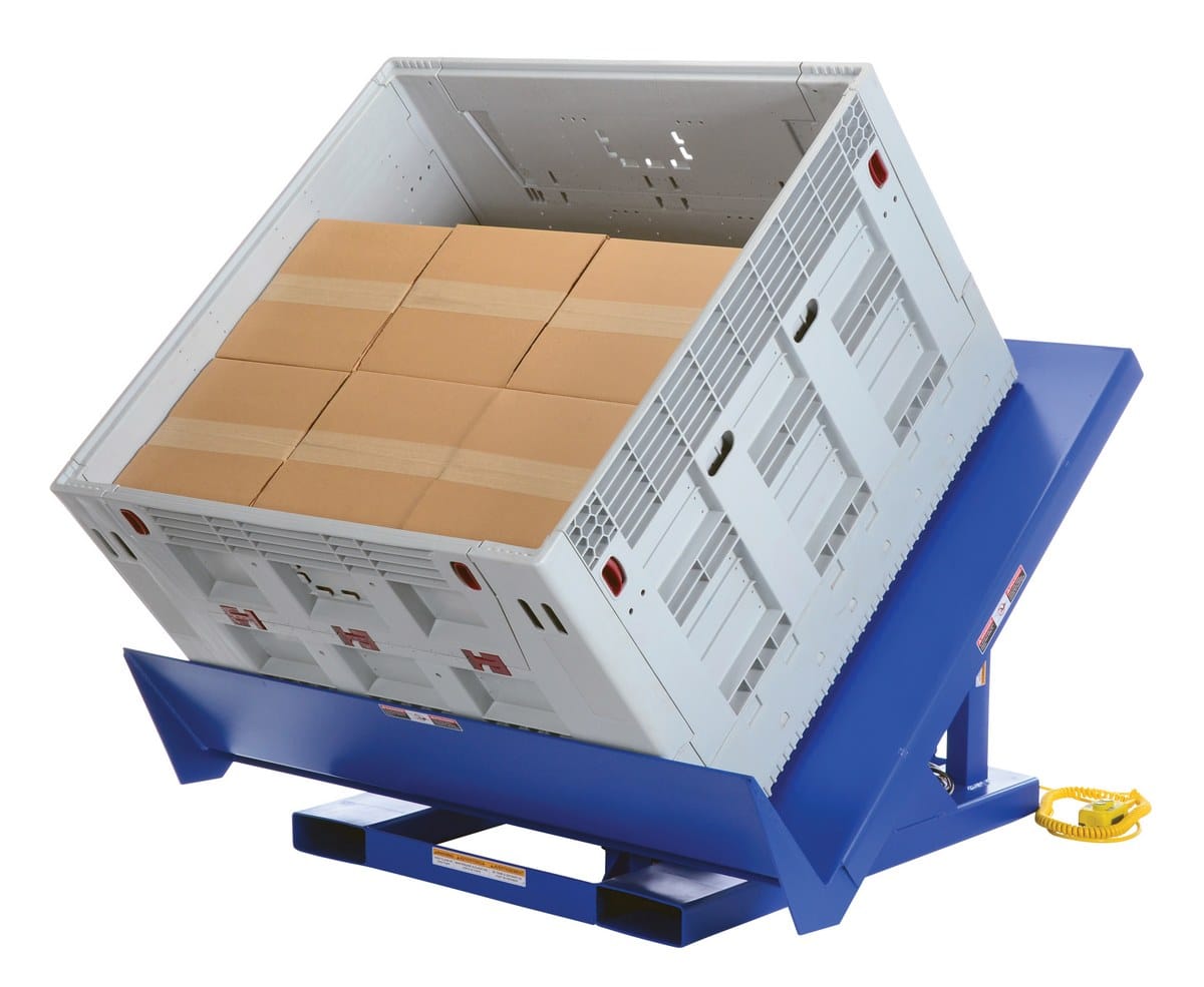 The Vestil EM1-200-6050-2 tilts pallets, crates, boxes, or baskets to facilitate easy container loading or unloading.