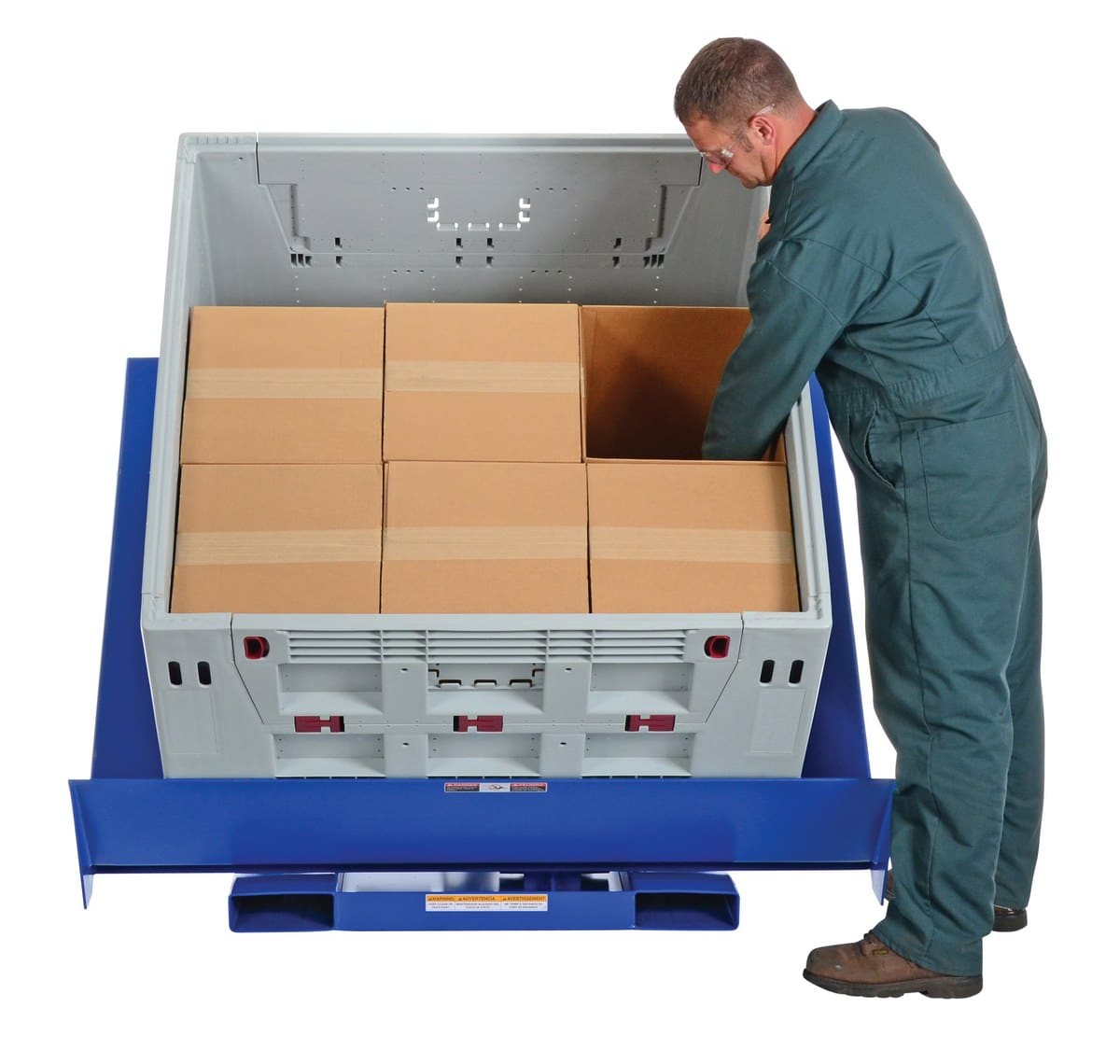 • Platform end lip safely supports containers when tilted