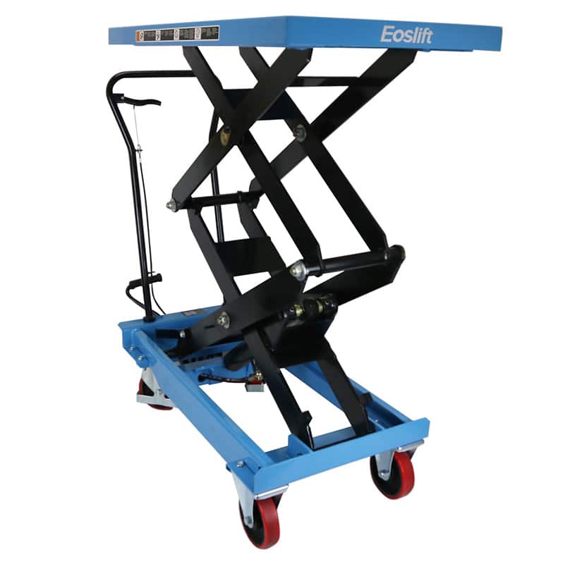 Eoslift TAD80 Dual Scissor Lift Table Cart. The load maximum is 1764 lbs., and it has a 62.4 in. raise height. The table measures 20.5 x 39.8 in. and is made of reinforced robotic welding to lift the heaviest items. It also features polyurethane wheels to complete any loading project.