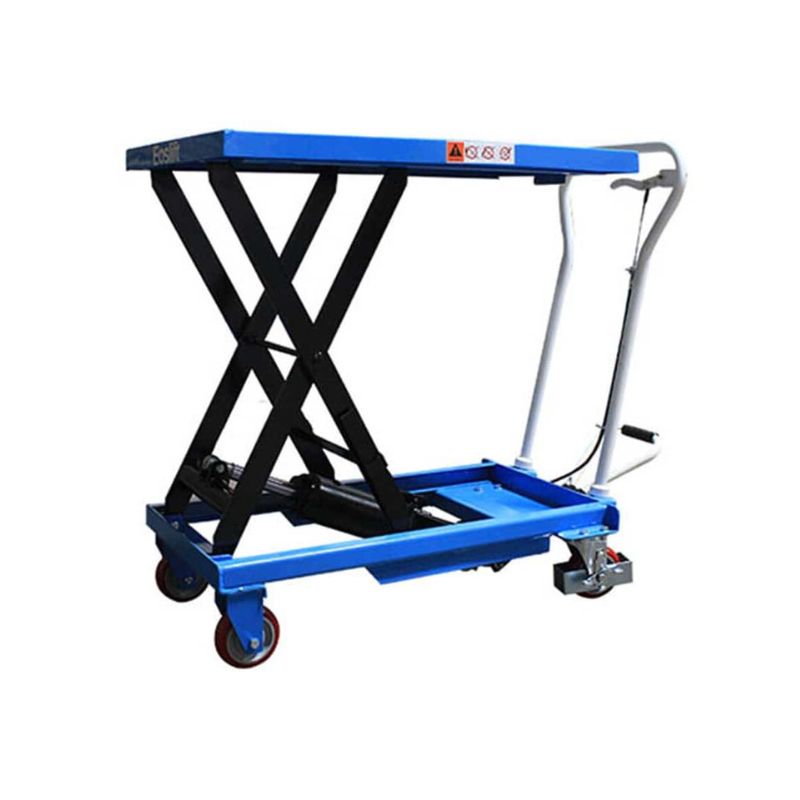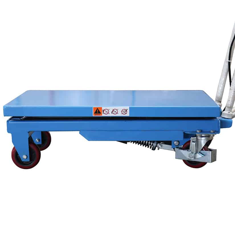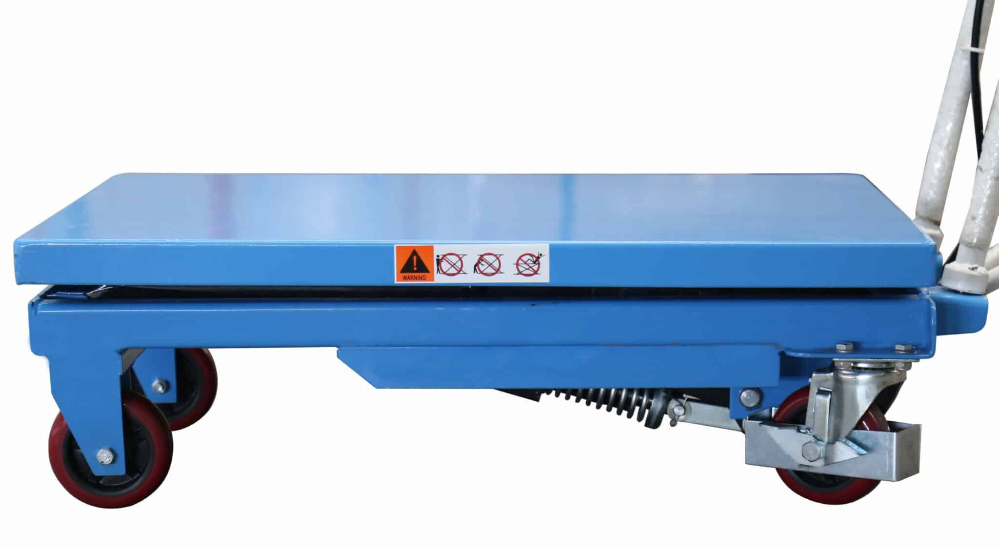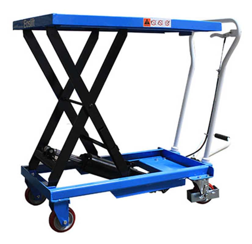 Eoslift TA15 Manual Scissor Lift Table Cart . The load maximum is 330 lbs., and it has a 29.7 in. raise height. The table measures 17.7 x 27.5 in. and is made of reinforced robotic welding to lift the heaviest items. It also features polyurethane wheels to complete any loading project.
