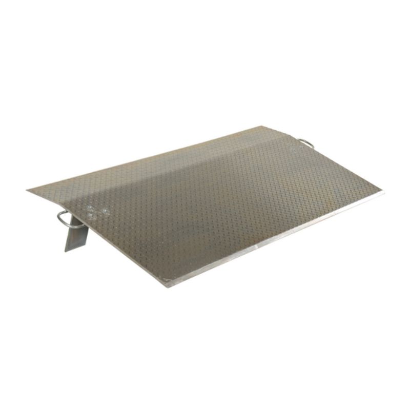 The Vestil EH-6042 Aluminum Economizer Dock Plate is an economical way to speed up truck loading and unloading. The unit spans the opening between dock and trailer to allow pallet or hand trucks along with traffic to safely move in and out of the trailer. The dock plate is constructed of high strength, non-skid aluminum alloy tread plate. The lightweight design with bolt on zinc plated legs and handles on each side makes portability easy. Locking legs for OSHA compliance. Not for use with fork trucks.