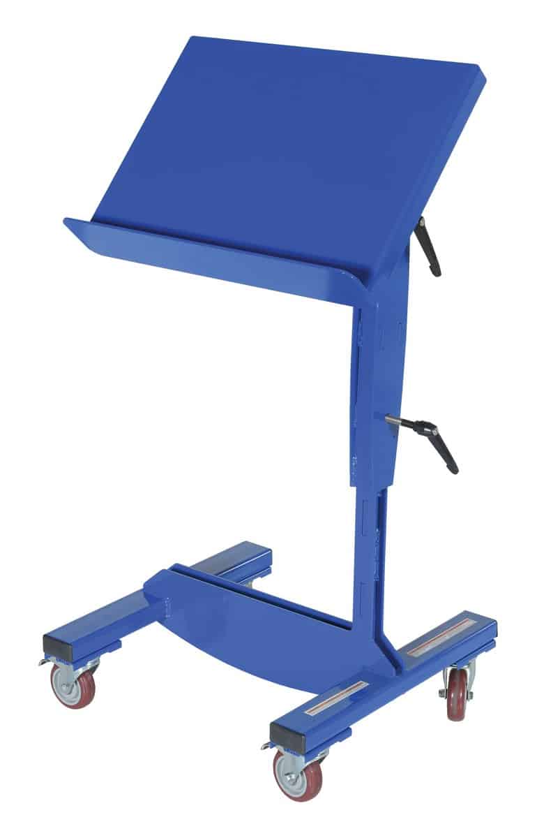 The Mobile Tilting Work Table is designed to bring work to an ergonomically correct position, helping to foster more comfortable and productive work environment. Working in a comfortable position also reduces fatigue and risk of injuries. The platform height and tilt angle are manually adjustable. The polyurethane swivel casters (two (2) double locking) allow unit to be transported from one work area to another while loaded.