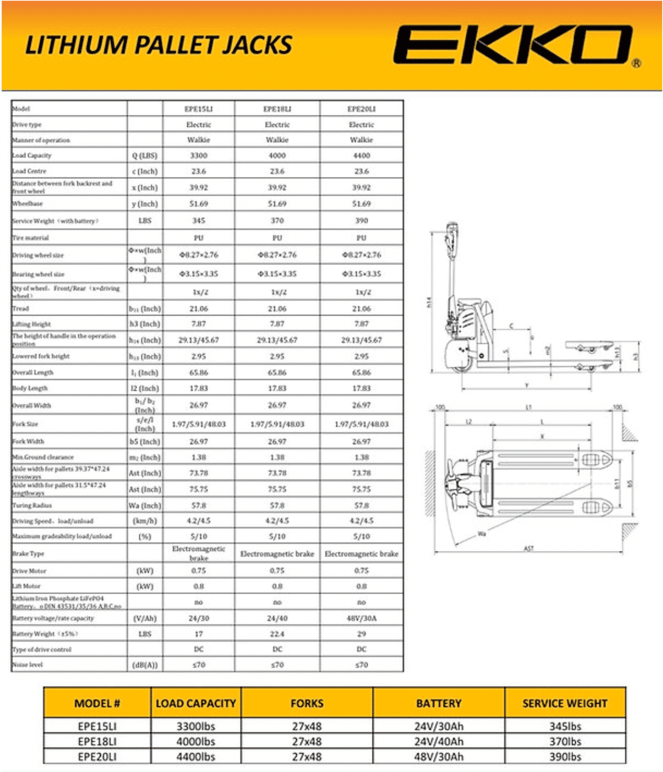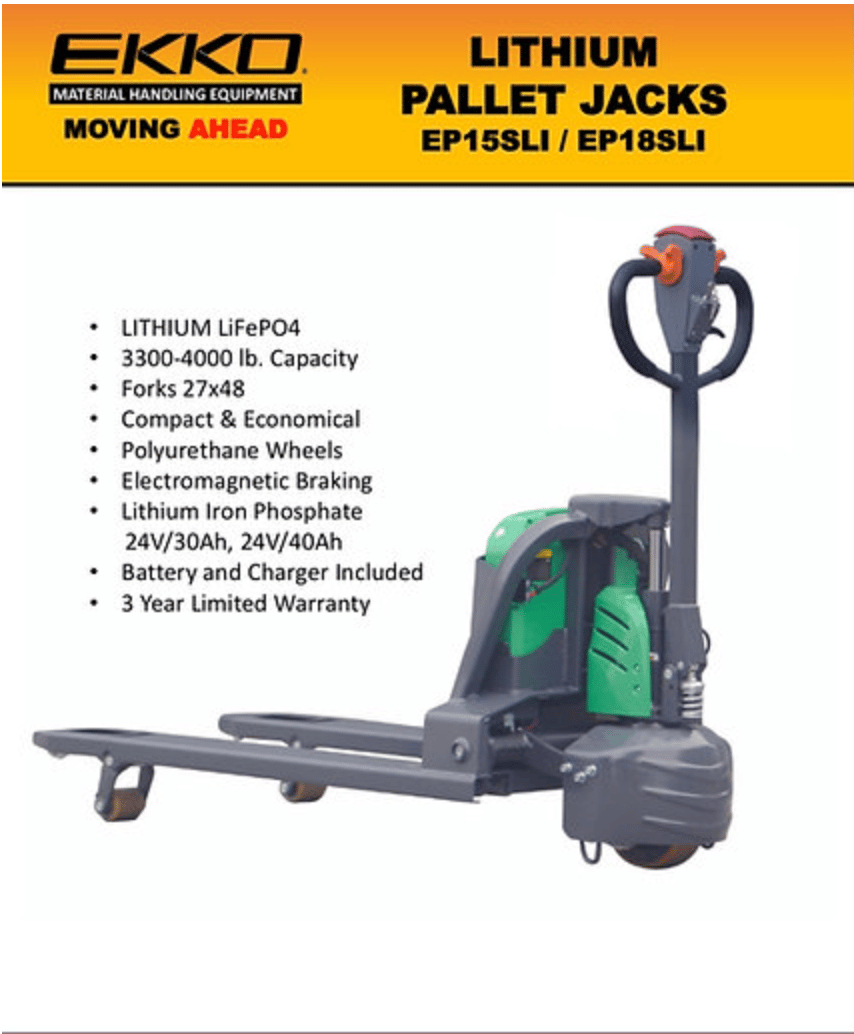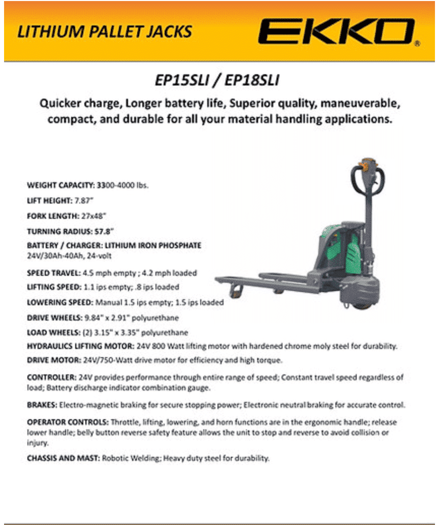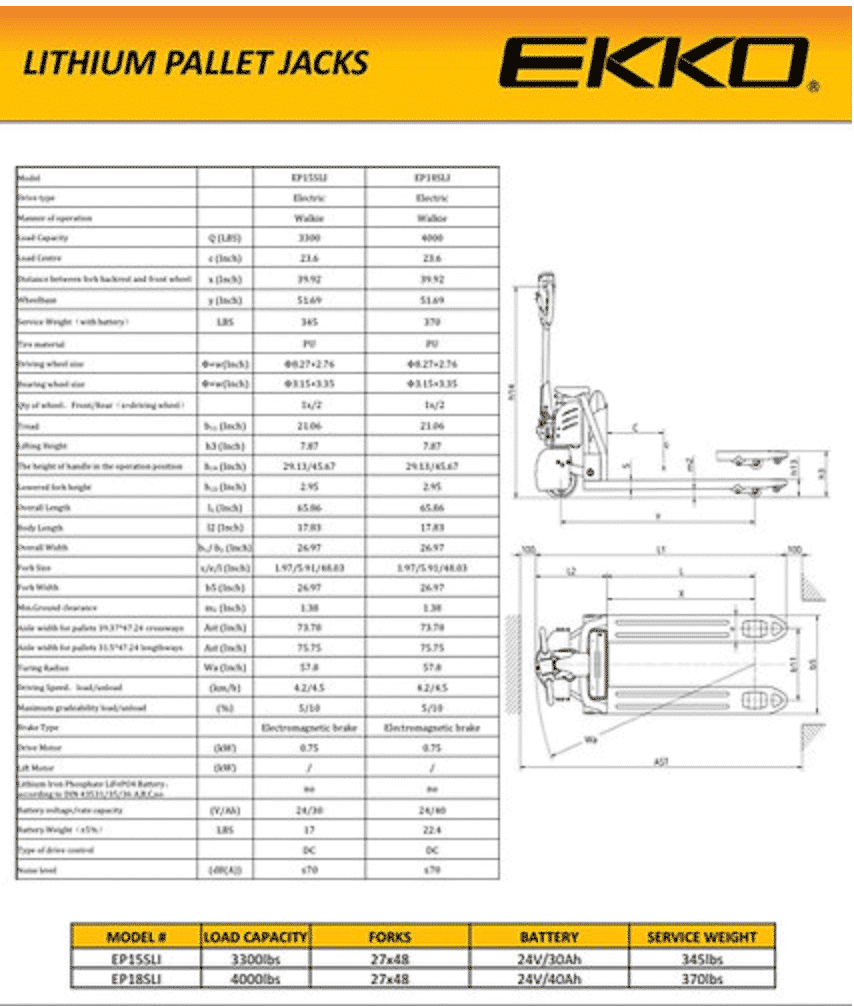 The EKKO EP18SLI Fully Electric Pallet Jack is a fully powered pallet jack that makes loading and unloading trucks, docks, or stock rooms effortless. Built with high-quality steel components for enhanced durability on any terrain, this electric unit ensures your projects can be completed reliably in multiple settings whether it’s dock work, manufacturing floors, or warehousing applications. Get the job done efficiently no matter the environment!