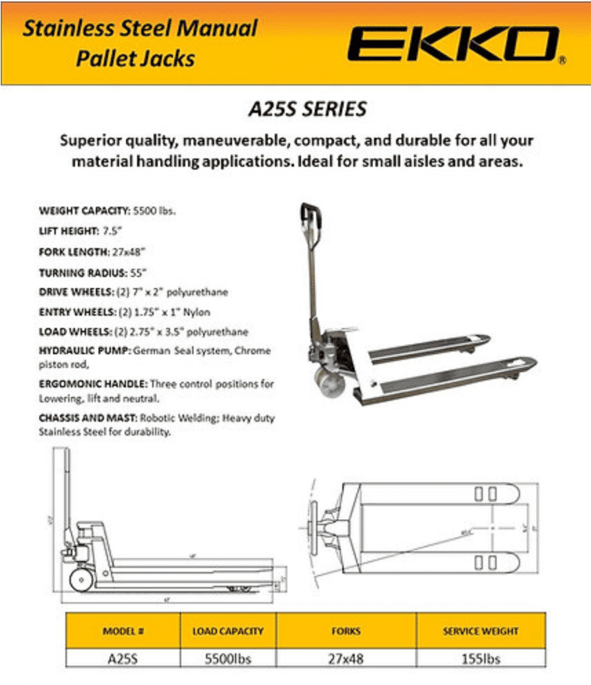 With its industrial-grade strength and robotic welding construction, the EKKO A25S Stainless Steel Manual Pallet Jack ensures exceptional long-term reliability. Crafted with 100% type 304 stainless steel to withstand even the most challenging sanitary, pharmaceutical, medical, or food environments – it eliminates strain in loading/unloading trucks and docks while delivering reliable results. Plus its durable hydraulic pumps & load wheels provide superior performance across any terrain for worry-free operation!