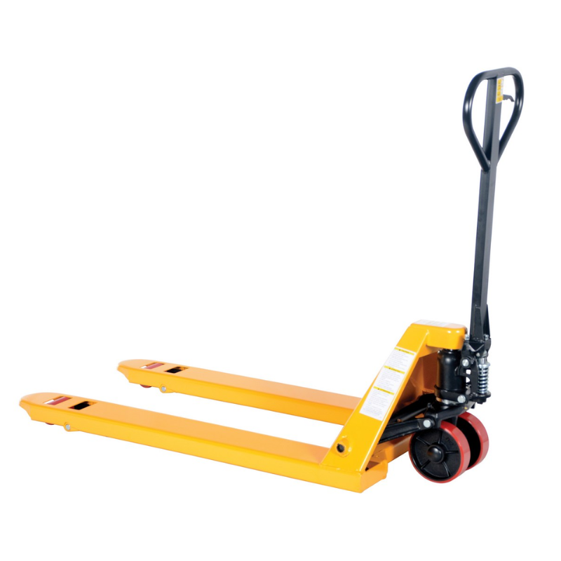 The Vestil PM5-2748-Y-6PKG Steel Pallet Truck is the trusted solution for efficient and reliable pallet load movement. With its proven ergonomic design and time-tested performance, this pallet truck is a cost-effective alternative to fork trucks. Designed to require only 75 pounds of pulling force even when fully loaded, it offers ergonomic convenience and ease of use. The spring-loaded hoop handle automatically returns to a vertical position when not in use, ensuring convenience and efficiency. The chrome-plated hydraulic pump piston guarantees a long seal life, while the quality construction and user-friendly features make maintenance hassle-free. Finished with a durable powder coat, this pallet truck is a must-have for any industrial setting.