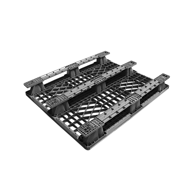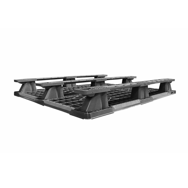 The Used EXP 102 plastic pallet is a black, four-way entry export pallet made from a blend of polypropylene and polyethylene plastics. This ventilated pallet has a 9-leg base with snap on 3 Runner skids to provide a dynamic capacity of 2,800 lbs., and a 6,600 lbs. static capacity.