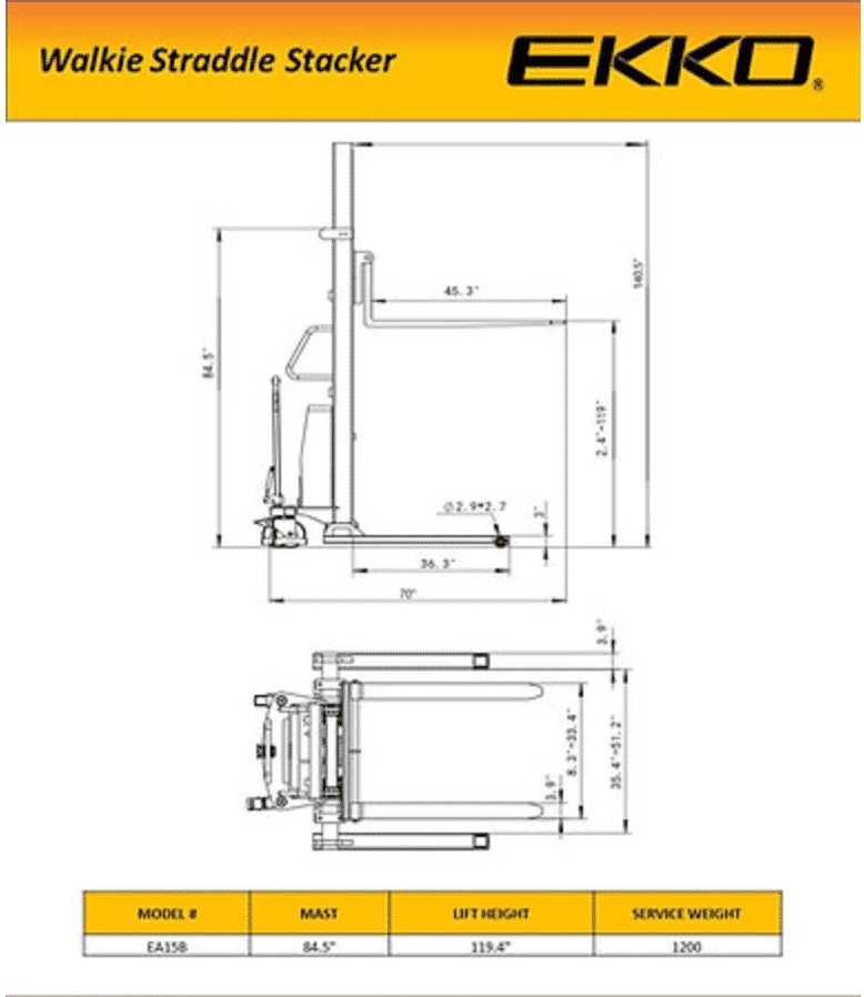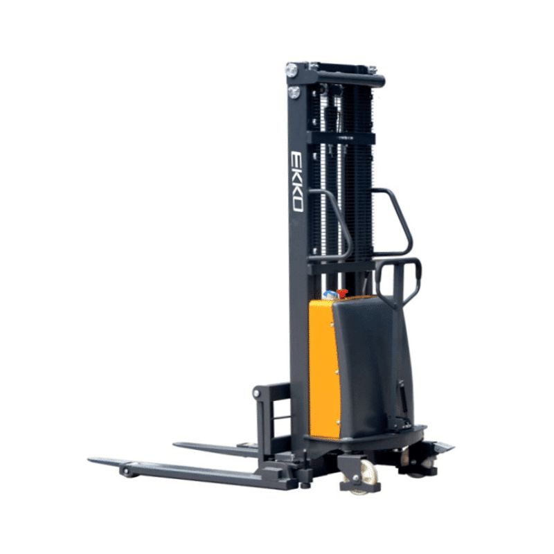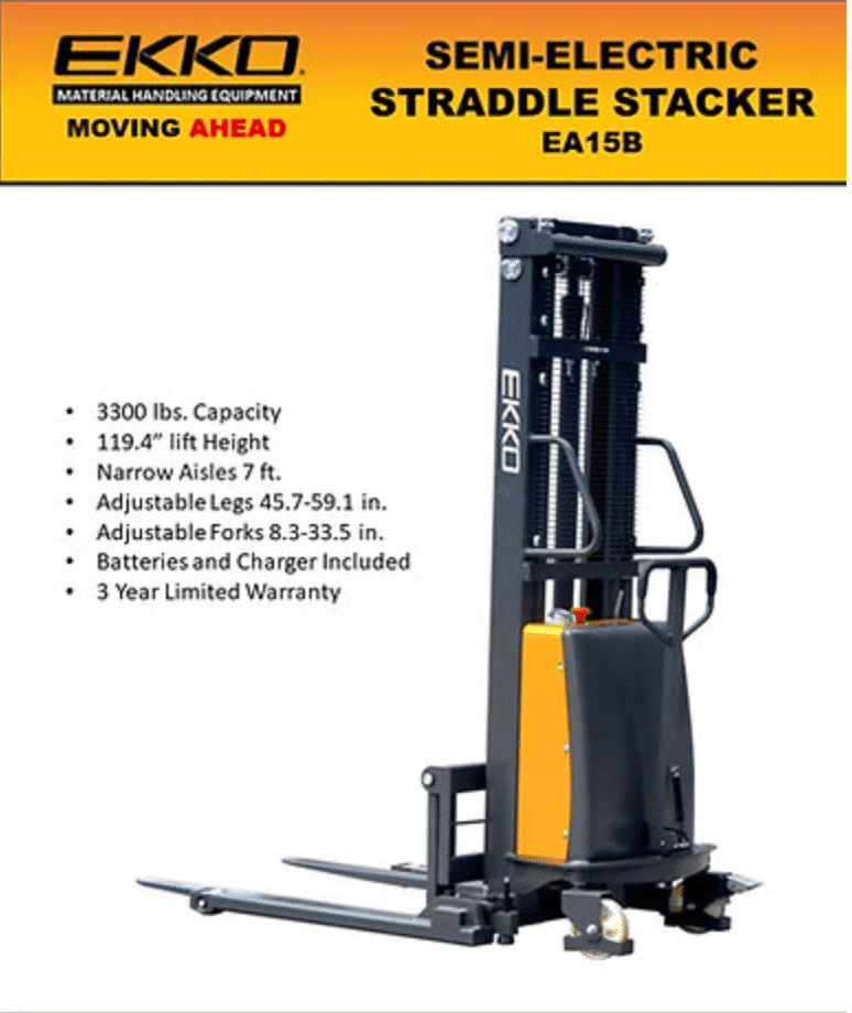 The EKKO EA15B Semi-Electric Straddle Stacker is the ideal tool for those who need a reliable and efficient way to unload trucks or stock shelves. It features robust steel components that make it capable of maneuvering any terrain with ease, making this stacker the perfect forklift/pallet hybrid choice in warehouses, manufacturing plants, and more!