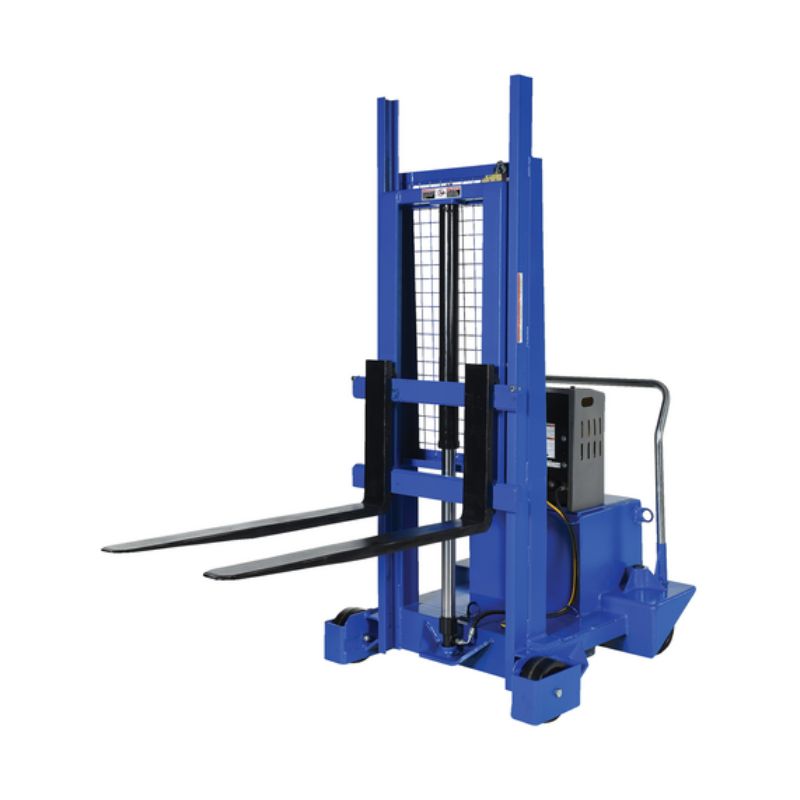 The Vestil Vestil CB-PMPS-10-50-AC Steel AC Counter Balance Pallet Master/Server moves pallets and skids from one workstation to another. The unit includes a dual guide wheel mast design for stabilization. It features a load center and adjustable forks. The unit rolls easily on the phenolic swivel rear casters with a floor lock standard.