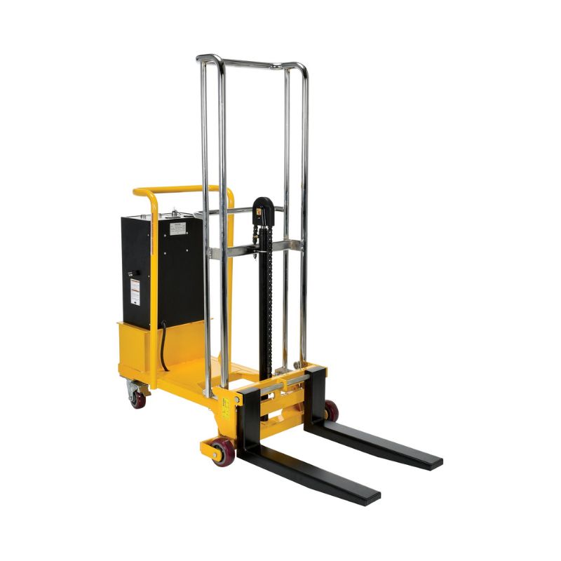 Vestil HYD-CB-10-DC Steel Counter Balanced Hefti-Lift 550 Lb. Capacity are user friendly providing reliable, powerful lifting when moving and positioning loads. Units roll easily on two rigid and two swivel poly-on-steel casters and include a foot operated brake. Not for use with pallets. All welded steel construction with chrome uprights. Variety of attachments available.