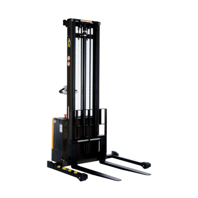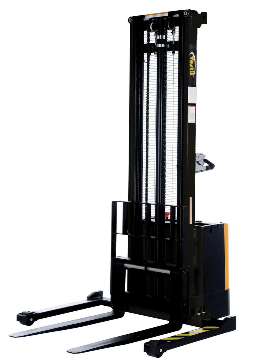 The Vestil S-150-AA Steel Adjustable Powered Lift Stacker is a fully powered electric stacker that transports loads throughout warehouse facilities quickly and with less effort. The high torque drive and lift motor handles heavy-duty jobs. The ergonomic handle features easy-to-operate throttle with infinite adjustment of forward and reverse speeds, lift/lower controls, proprietary safety-enhancing emergency reverse function, and horn. When the Proprietary Safety-enhancing Emergency Reverse function is actuated, the emergency reverse belly switch instantly reverses direction and moves the unit forward (away from the operator) until the switch is released or after five seconds have elapsed. The built-in safety circuit will automatically disable the entire unit if the emergency reverse belly switch is activated for more than five (5) seconds after which the unit must be re-set to return to normal operating conditions. This state-of-the-art safety device provides a high degree of operator protection. It includes an electromagnetic disc brake with automatic dead-man feature that activates when user releases the handle. The power lifter features a lead acid deep cycle battery, integral battery charger, and a battery level gauge. The stacker rolls smoothly on poly-on-steel steer and load wheels.