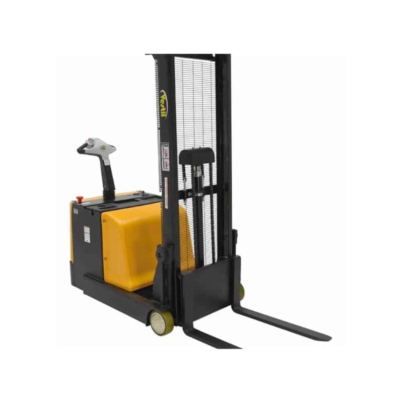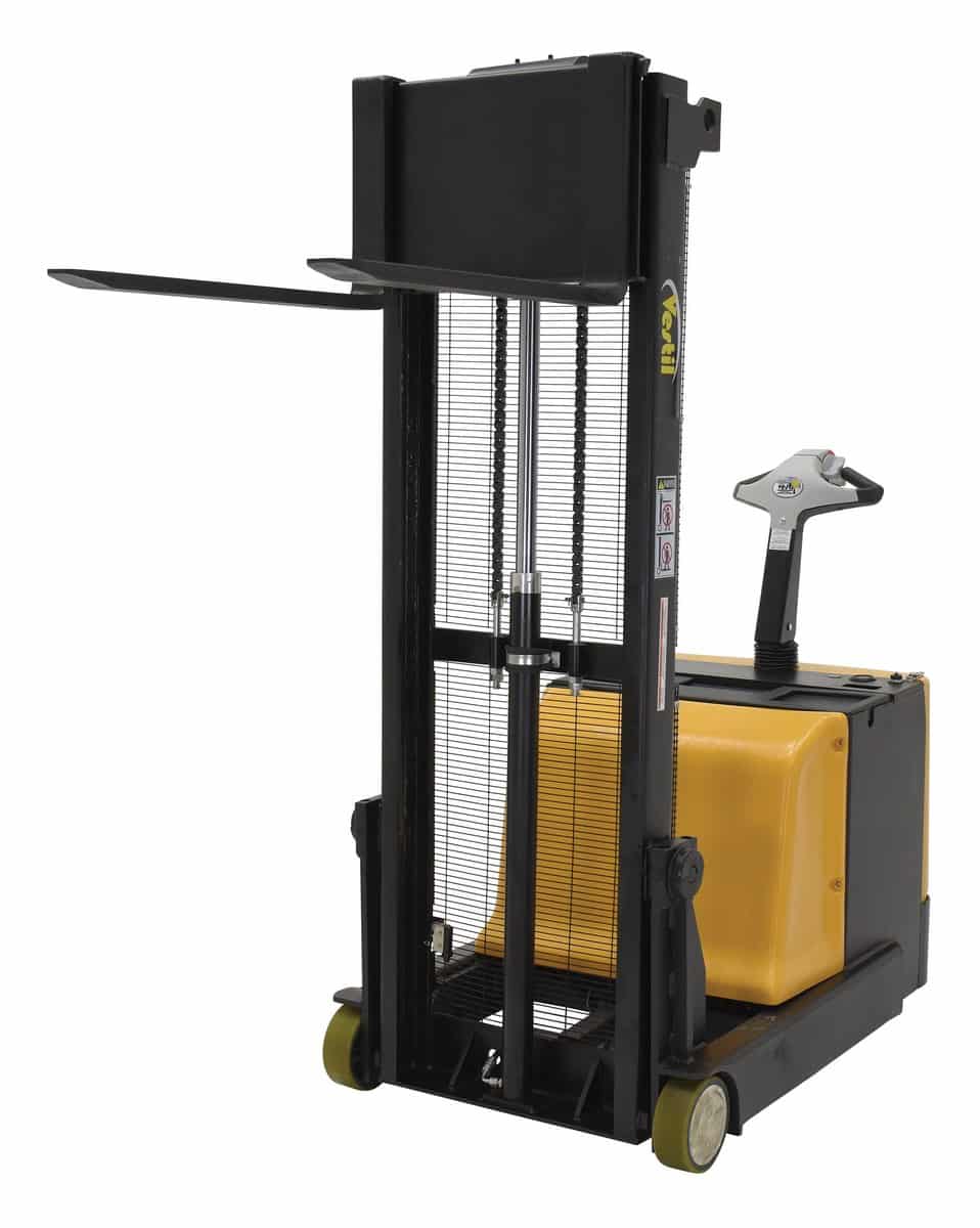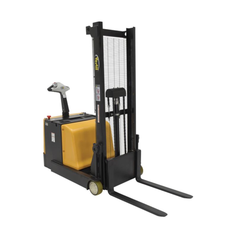 The Vestil S-CB-62 Steel Counter Balanced Powered Lift is ideal for die loading, machine feeding, and for loading and unloading trucks. The high torque drive and lift motor handles heavy-duty jobs. The ergonomic handle features an easy-to-operate throttle with infinite adjustment of forward and reverse speeds, lift/lower controls, proprietary safety-enhancing emergency reverse function, and horn. When the Proprietary Safety-enhancing Emergency Reverse function is actuated, the emergency reverse belly switch instantly reverses direction and moves the unit forward (away from the operator) until the switch is released or after five (5) seconds have elapsed. The built-in safety circuit will automatically disable the entire unit if the emergency reverse belly switch is activated for more than five (5) seconds after which the unit must be re-set to return to normal operating conditions. This state-of-the-art safety device provides a high degree of operator protection. Includes an electromagnetic disc brake with automatic dead-man feature that activates when the user releases the handle. The powered lift has lead acid deep cycle batteries, an integral battery charger, and battery level gauge. The stacker rolls smoothly on poly-on-steel steer & load wheels. The high level of serviceability simplifies maintenance and prolongs equipment life. The forks adjust to suit different pallets and the easy access battery compartment simplifies battery maintenance.