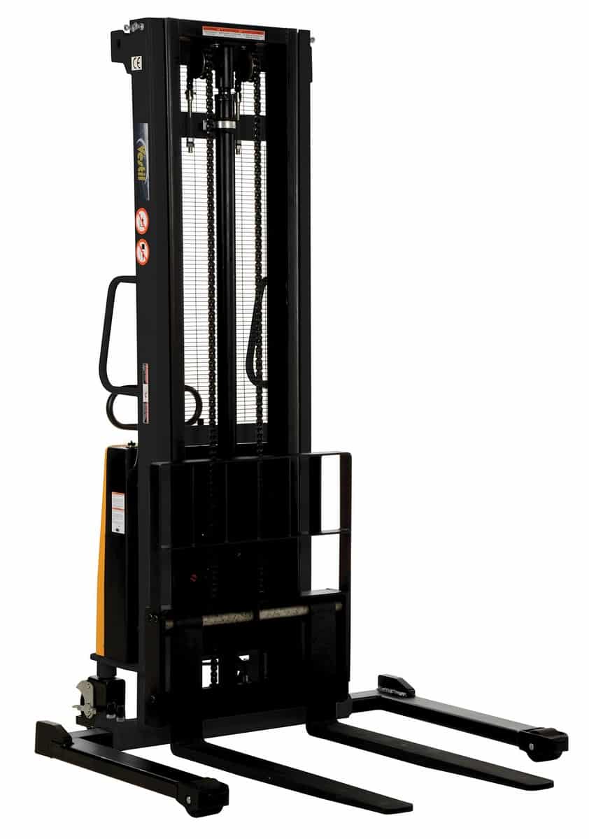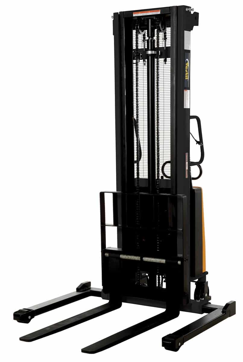 The Vestil SL-137-AA Adjustable Stacker with Powered Lift is a semi-electric stacker with a powered lift that will raise and lower loads quickly and easily. The manual push operation stacker is made using high quality material and parts. The Stacker is easily maneuvered using the standard pulling handle with adjustable forks and adjustable support legs. The stacker is highly efficient and durable while working with pallets or skids. It features an integral battery charger and battery level gauge.