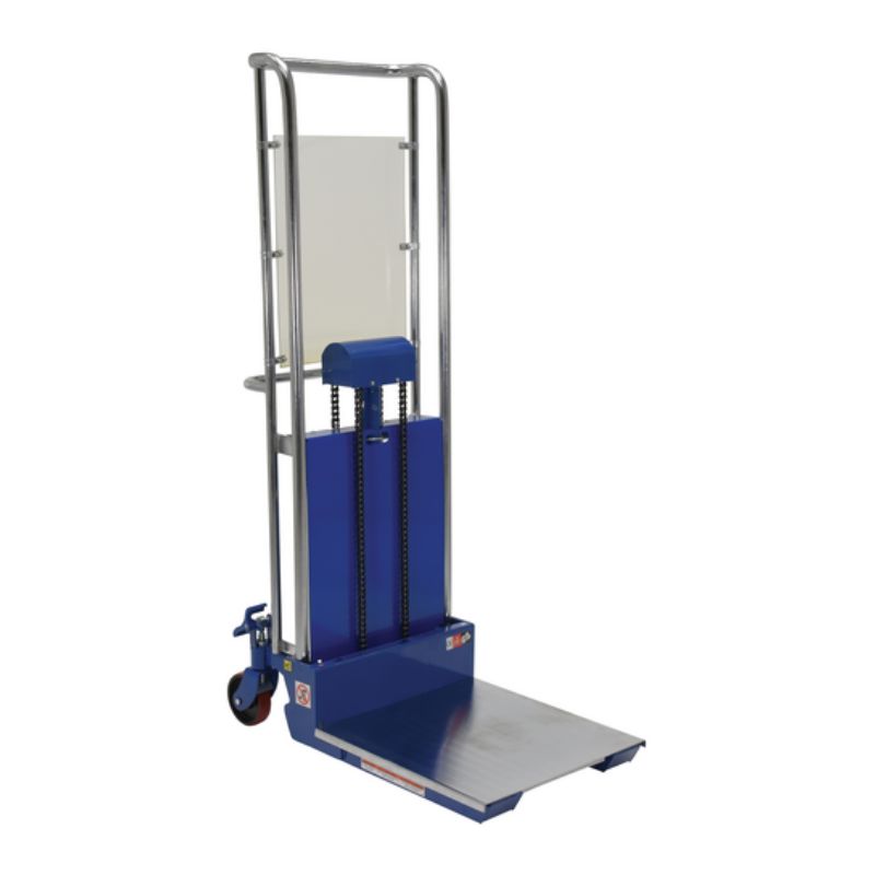 The Vestil HYD-10 Steel Portable Foot Pump Hetti-Lift is a user friendly, portable hydraulic lift. The lift provides reliable, power lifting when moving and positioning loads. It includes a removable platform for operation requiring forks. The non-slip chain is used for accurate positioning while the lift rolls easily on two rigid and two swivel poly-on-steel casters that includes a foot operated brake. The unit has an all welded construction with a chrome platform and uprights. Not for use with pallets.