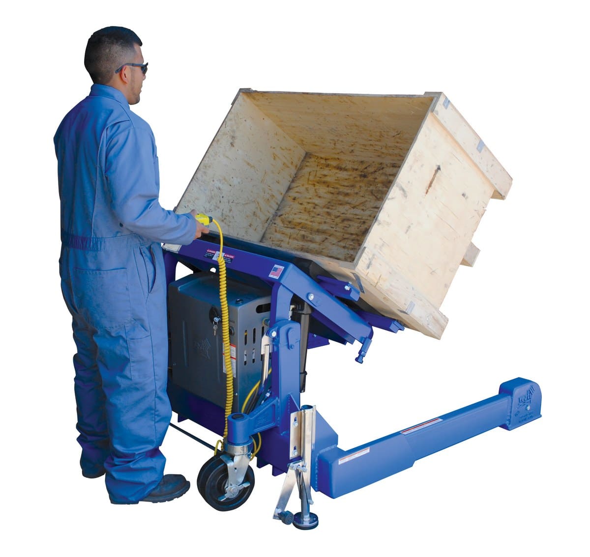 The Vestil TMS-20-DC Steel Tilt Master Straddle lifts and positions filled tote boxes or baskets without the need of a fork truck or lift table using the newly designed heavy-duty tilt master. The tilter will function as transporters by moving completed products from work station to work station without waiting for a fork truck. It features a folding ergonomic handle for quick and easy maneuverability. This Lift has a thin profile to allow the user to get as close to the load as possible. It also has a standard floor lock and rolls easily on the phenolic steering wheels. Lift is designed to be used with virtually any kind of container or pallet. The unit is powered by a DC electric motor that includes an on-board battery charger, battery charge indicator and comes standard with a push-button hand control on a coil cord.