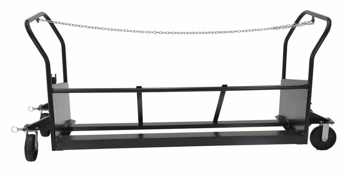 The Trash Can Cart can store and transport up to three trash cans at a time. The trash cans are secured with a heavy-duty safety chain with push handles located at each end of the cart. The unit rolls on two rigid and two swivel 4 position locking casters for portability. The hinged tow bar is located at one end for towing behind utility vehicles. The unit has a low profile design with a welded steel construction and a powder-coat finish.